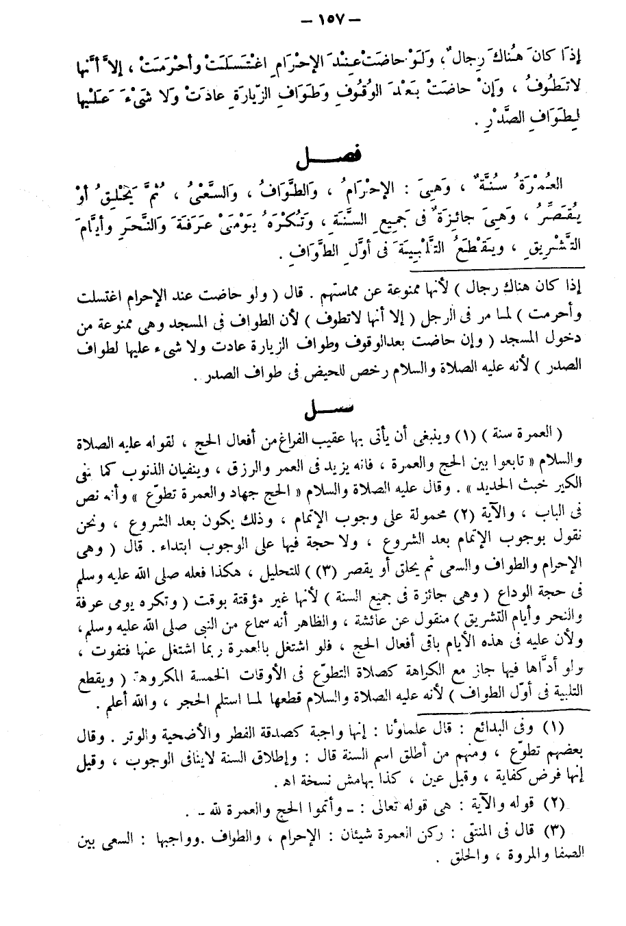 فَصْلٌ الْعُمْرَةُ سُنَّةٌ، وَهِيَ: الْإِحْرَامُ، وَالطَّوَافُ، وَالسَّعْيُ، ثُمَّ يَحْلِقُ أَوْ يُقَصِّرُ، وَهِيَ جَائِزَةٌ فِي جَمِيعِ السَّنَةِ، وَتُكْرَهُ يَوْمَيْ عَرَفَةَ وَالنَّحْرِ وَأَيَّامَ التَّشْرِيقِ، وَيَقْطَعُ التَّلْبِيَةَ فِي أَوَّلِ الطَّوَافِ.