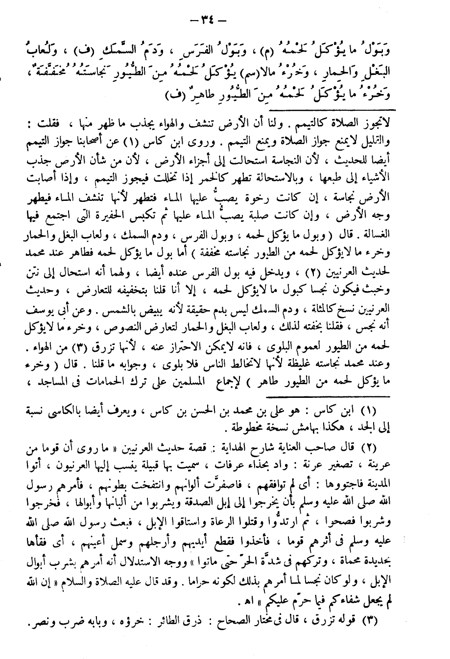 قَالَ: (وَبَوْلُ مَا يُؤْكَلُ لَحْمُهُ، وَبَوْلُ الْفَرَسِ، وَدَمُ السَّمَكِ، وَلُعَابُ الْبَغْلِ وَالْحِمَارِ وَخُرْءُ مَا لَا يُؤْكَلُ لَحْمُهُ مِنَ الطُّيُورِ نَجَاسَتُهُ مُخَفَّفَةٌ) أَمَّا بَوْلُ مَا يُؤْكَلُ لَحْمُهُ فَطَاهِرٌ عِنْدَ مُحَمَّدٍ لِحَدِيثِ الْعُرَنِيِّينَ، وَيَدْخُلُ فِيهِ بَوْلُ الْفَرَسِ عِنْدَهُ أَيْضًا، وَلَهُمَا أَنَّهُ اسْتَحَالَ إِلَى نَتَنٍ وَخَبَثٍ فَيَكُونُ نَجِسًا كَبَوْلِ مَا لَا يُؤْكَلُ لَحْمُهُ، إِلَّا أَنَّا قُلْنَا بِتَخْفِيفِهِ لِلتَّعَارُضِ، وَحَدِيثُ الْعَرَنِيِينِ نُسِخَ كَالْمُثْلَةِ، وَدَمُ السَّمَكِ لَيْسَ بِدَمٍ حَقِيقَةً لِأَنَّهُ يَبِيضُ بِالشَّمْسِ. وَعَنْ أَبِي يُوسُفَ أَنَّهُ نَجِسٌ، فَقُلْنَا بِخِفَّتِهِ لِذَلِكَ، وَلُعَابُ الْبَغْلِ وَالْحِمَارِ لِتَعَارُضِ النُّصُوصِ، وَخُرْءُ مَا لَا يُؤْكَلُ لَحْمُهُ مِنَ الطُّيُورِ لِعُمُومِ الْبَلْوَى، فَإِنَّهُ لَا يُمْكِنُ الِاحْتِرَازُ عَنْهُ، لِأَنَّهَا تَزْرَقُ مِنَ الْهَوَاءِ. وَعِنْدَ مُحَمَّدٍ نَجَاسَتُهُ غَلِيظَةٌ؛ لِأَنَّهَا لَا تُخَالِطُ النَّاسَ فَلَا بَلْوَى، وَجَوَابُهُ مَا قُلْنَا.