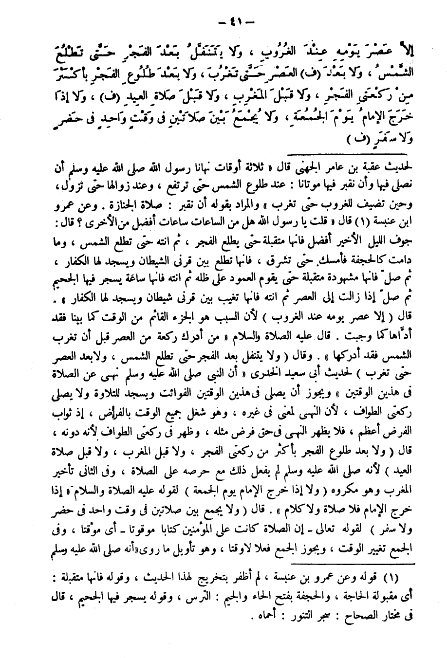 ـــــــــــــــــــــــــــــQلِحَدِيثِ عُقْبَةَ بْنِ عَامِرٍ الْجُهَنِيِّ قَالَ: «ثَلَاثَةُ أَوْقَاتٍ نَهَانَا رَسُولُ اللَّهِ - صَلَّى اللَّهُ عَلَيْهِ وَسَلَّمَ - أَنْ نُصَلِّيَ فِيهَا وَأَنْ نَقْبُرَ فِيهَا مَوْتَانَا: عَنَدَ طُلُوعِ الشَّمْسِ حَتَّى تَرْتَفِعَ، وَعِنْدَ زَوَالِهَا حَتَّى تَزُولَ، وَحِينَ تَضَيَّفُ لِلْغُرُوبِ حَتَّى تَغْرُبَ» ، وَالْمُرَادُ بِقَوْلِهِ أَنْ نَقْبُرَ: صَلَاةُ الْجِنَازَةِ. وَعَنْ عَمْرِو بْنِ عَنْبَسَةَ قَالَ: «قُلْتُ يَا رَسُولَ اللَّهِ - صَلَّى اللَّهُ عَلَيْهِ وَسَلَّمَ - هَلْ مِنَ السَّاعَاتِ سَاعَاتٌ أَفْضَلُ مِنَ الْأُخْرَى؟ قَالَ: " جَوْفُ اللَّيْلِ الْأَخِيرِ أَفْضَلُ فَإِنَّهَا مُتَقَبَّلَةٌ حَتَّى يَطْلُعَ الْفَجْرُ، ثُمَّ انْتَهِ حَتَّى تَطْلُعَ الشَّمْسُ، وَمَا دَامَتْ كَالْحَجَفَةِ فَأَمْسِكْ حَتَّى تُشْرِقَ، فَإِنَّهَا تَطْلُعُ بَيْنَ قَرْنَيِ الشَّيْطَانِ وَيَسْجُدُ لَهَا الْكُفَّارُ، ثُمَّ صَلِّ فَإِنَّهَا مَشْهُودَةٌ مُتَقَبَّلَةٌ حَتَّى يَقُومَ الْعَمُودُ عَلَى ظِلِّهِ ثُمَّ انْتَهِ فَإِنَّهَا سَاعَةٌ يُسَجَّرُ فِيهَا الْجَحِيمُ ثُمَّ صَلِّ إِذَا زَالَتْ إِلَى الْعَصْرِ ثُمَّ انْتَهِ فَإِنَّهَا تَغِيبُ بَيْنَ قَرْنَيْ شَيْطَانٍ وَيَسْجُدُ لَهَا الْكُفَّارُ» .