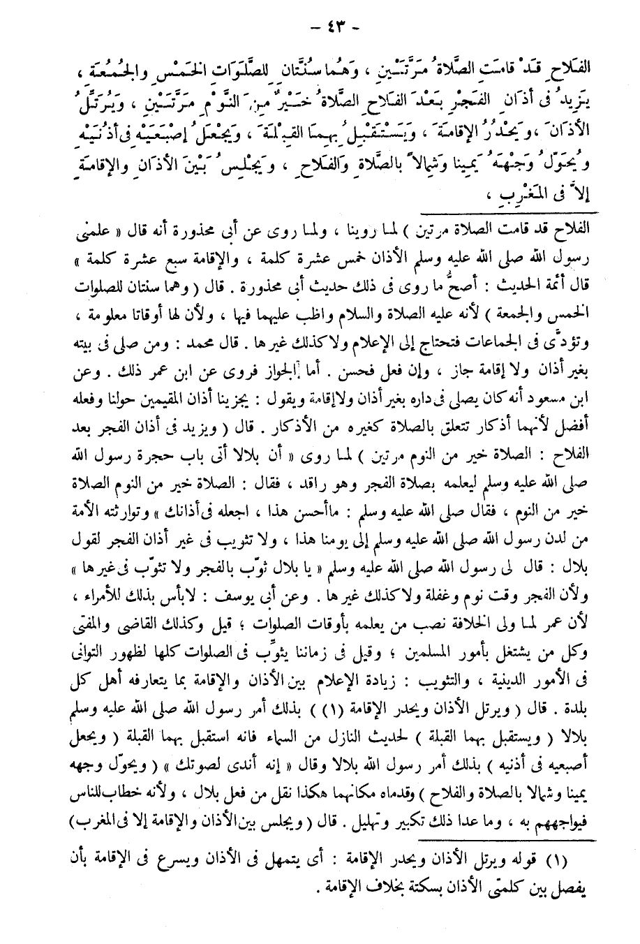 الْفَلَاحِ قَدْ قَامَتِ الصَّلَاةُ مَرَّتَيْنِ، وَهُمَا سُنَّتَانِ لِلصَّلَوَاتِ الْخَمْسِ وَالْجُمُعَةِ، يَزِيدُ فِي أَذَانِ الْفَجْرِ بَعْدَ الْفَلَاحِ الصَّلَاةُ خَيْرٌ مِنَ النَّوْمِ مَرَّتَيْنِ، وَيُرَتِّلُ الْأَذَانَ، وَيَحْدُرُ الْإِقَامَةَ، وَيَسْتَقْبِلُ بِهِمَا الْقِبْلَةَ، وَيَجْعَلُ إِصْبَعَيْهِ فِي أُذُنَيْهِ وَيُحَوِّلُ وَجْهَهُ يَمِينًا وَشِمَالًا بِالصَّلَاةِ وَالْفَلَاحِ، وَيَجْلِسُ بَيْنَ الْأَذَانِ وَالْإِقَامَةِ إِلَّا فِي الْمَغْرِبِ،