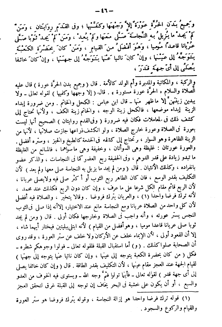 وَجَمِيعُ بَدَنِ الْحُرَّةِ عَوْرَةٌ إِلَّا وَجْهَهَا وَكَفَّيْهَا ; وَفِي الْقَدَمِ رِوَايَتَانِ، وَمَنْ لَمْ يَجِدْ مَا يُزِيلُ بِهِ النَّجَاسَةَ صَلَّى مَعَهَا وَلَمْ يُعِدْ، وَمَنْ لَمْ يَجِدْ ثَوْبًا صَلَّى عُرْيَانًا قَاعِدًا مُومِيًا، وَهُوَ أَفْضَلُ مِنَ الْقِيَامِ، وَمَنْ كَانَ بِحَضْرَةِ الْكَعْبَةِ يَتَوَجَّهُ إِلَى عَيْنِهَا، وَإِنْ كَانَ نَائِيًا عَنْهَا يَتَوَجَّهُ إِلَى جِهَتِهَا، وَإِنْ كَانَ خَائِفًا يُصَلِّي إِلَى أَيِّ جِهَةٍ قَدَرَ،