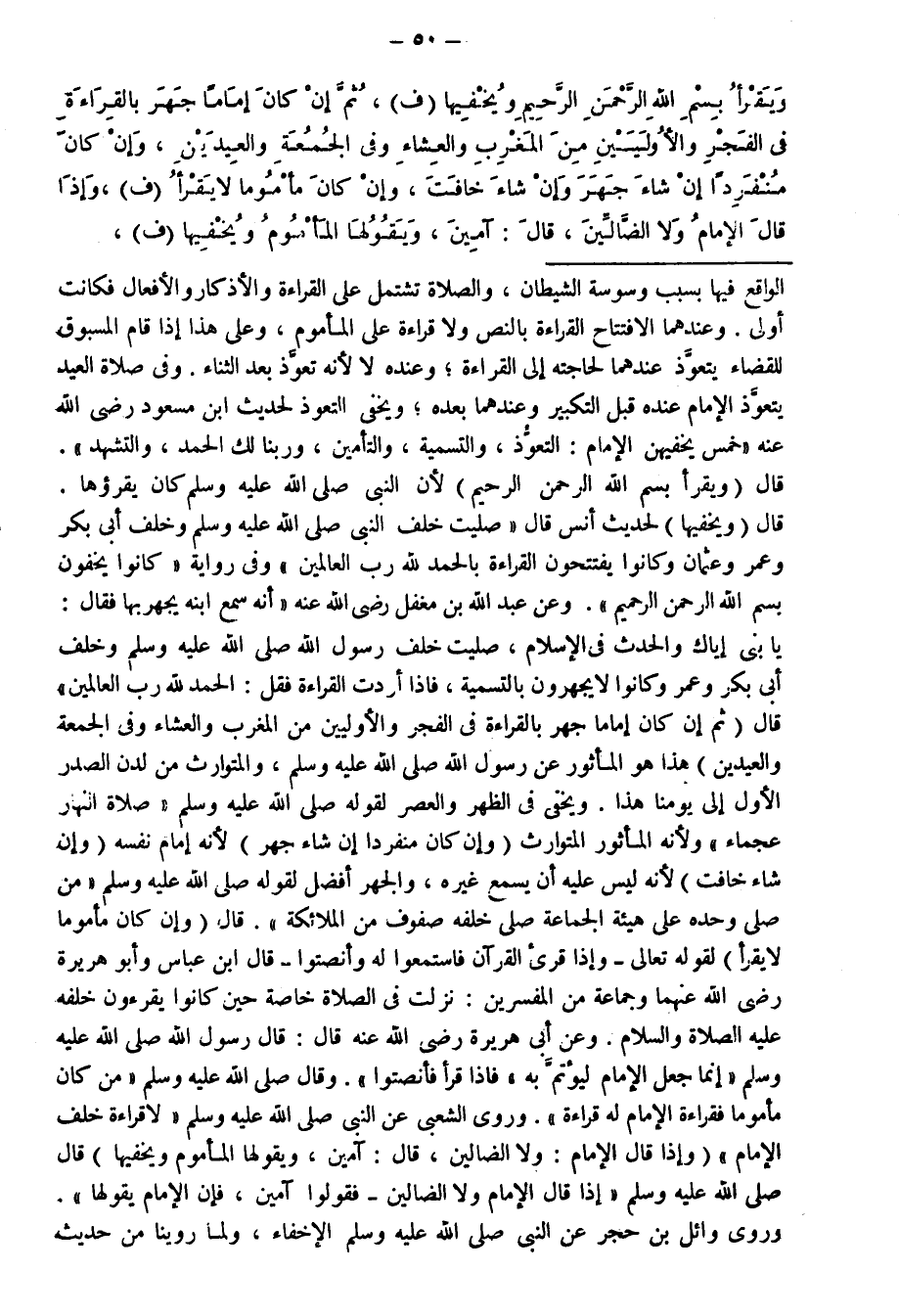وَيَقْرَأُ بِسْمِ اللَّهِ الرَّحْمَنِ الرَّحِيمِ وَيُخْفِيهَا (ف) ، ثُمَّ إِنْ كَانَ إِمَامًا جَهَرَ بِالْقِرَاءَةِ فِي الْفَجْرِ وَالْأُولَيَيْنِ مِنَ الْمَغْرِبِ وَالْعِشَاءِ وَفِي الْجُمُعَةِ وَالْعِيدَيْنِ، وَإِنْ كَانَ مُنْفَرِدًا إِنْ شَاءَ جَهَرَ وَإِنْ شَاءَ خَافَتَ، وَإِنْ كَانَ مَأْمُومًا لَا يَقْرَأُ (ف) ، وَإِذَا قَالَ الْإِمَامُ: وَلَا الضَّالِّينَ، قَالَ: آمِينَ، وَيَقُولُهَا الْمَأْمُومُ وَيُخْفِيهَا (ف) ،