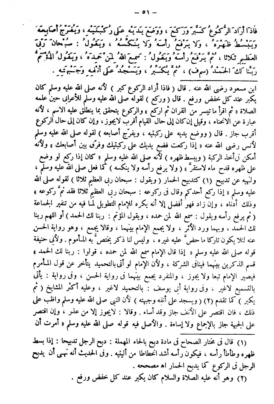 (وَيَبْسُطُ ظَهْرَهُ) لِأَنَّهُ - صَلَّى اللَّهُ عَلَيْهِ وَسَلَّمَ -: «كَانَ إِذَا رَكَعَ لَوْ وُضِعَ عَلَى ظَهْرِهِ قَدَحُ مَاءٍ لَاسْتَقَرَّ» . (وَلَا يَرْفَعُ رَأْسَهُ وَلَا يُنَكِّسُهُ) كَمَا فَعَلَ - صَلَّى اللَّهُ عَلَيْهِ وَسَلَّمَ -، وَلِنَهْيِهِ عَنْ تَدْبِيحٍ كَتَدْبِيحِ الْحِمَارِ ".