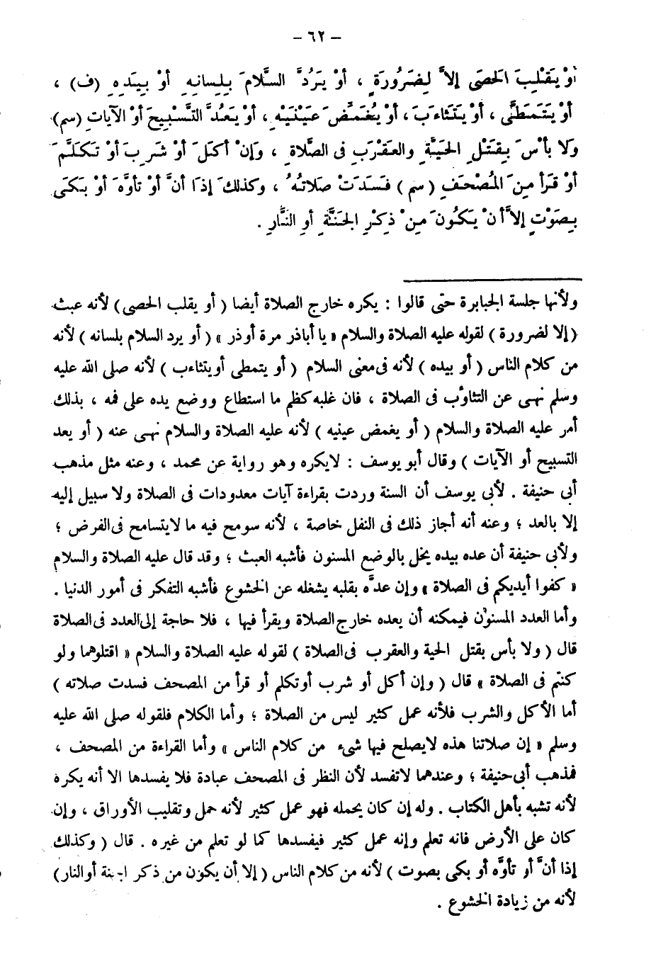 أَوْ يَقْلِبَ الْحَصَى إِلَّا لِضَرُورَةٍ، أَوْ يَرُدَّ السَّلَامَ بِلِسَانِهِ أَوْ بِيَدِهِ (ف) ، أَوْ يَتَمَطَّى، أَوْ يَتَثَاءَبَ، أَوْ يُغْمِضَ عَيْنَيْهِ، أَوْ يَعُدَّ التَّسْبِيحَ أَوِ الْآيَاتِ (سم) وَلَا بَأْسَ بِقَتْلِ الْحَيَّةِ وَالْعَقْرَبِ فِي الصَّلَاةِ، وَإِنْ أَكَلَ أَوْ شَرِبَ أَوْ تَكَلَّمَ أَوْ قَرَأَ مِنَ الْمُصْحَفِ (سم) فَسَدَتْ صَلَاتُهُ، وَكَذَلِكَ إِذَا أَنَّ أَوْ تَأَوَّهَ أَوْ بَكَى بِصَوْتٍ إِلَّا أَنْ يَكُونَ مِنْ ذِكْرِ الْجَنَّةِ أَوِ النَّارِ.