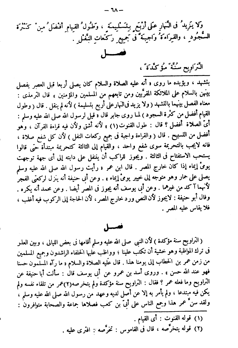 وَرَوَى أَسَدُ بْنُ عَمْرٍو عَنْ أَبِي يُوسُفَ قَالَ: سَأَلْتُ أَبَا حَنِيفَةَ عَنِ التَّرَاوِيحِ وَمَا فَعَلَهُ عُمَرُ؟ فَقَالَ: التَّرَاوِيحُ سُنَّةٌ مُؤَكَّدَةٌ وَلَمْ يَتَخَرَّصْهُ عُمَرُ مِنْ تِلْقَاءِ نَفْسِهِ وَلَمْ يَكُنْ فِيهِ مُبْتَدِعًا، وَلَمْ يَأْمُرْ بِهِ إِلَّا عَنْ أَصْلٍ لَدَيْهِ وَعَهْدٍ مِنْ رَسُولِ اللَّهِ - صَلَّى اللَّهُ عَلَيْهِ وَسَلَّمَ -، وَلَقَدْ سَنَّ عُمَرُ هَذَا وَجَمَعَ النَّاسَ عَلَى أُبَيِّ بْنِ كَعْبٍ فَصَلَّاهَا جَمَاعَةً وَالصَّحَابَةُ مُتَوَافِرُونَ:
