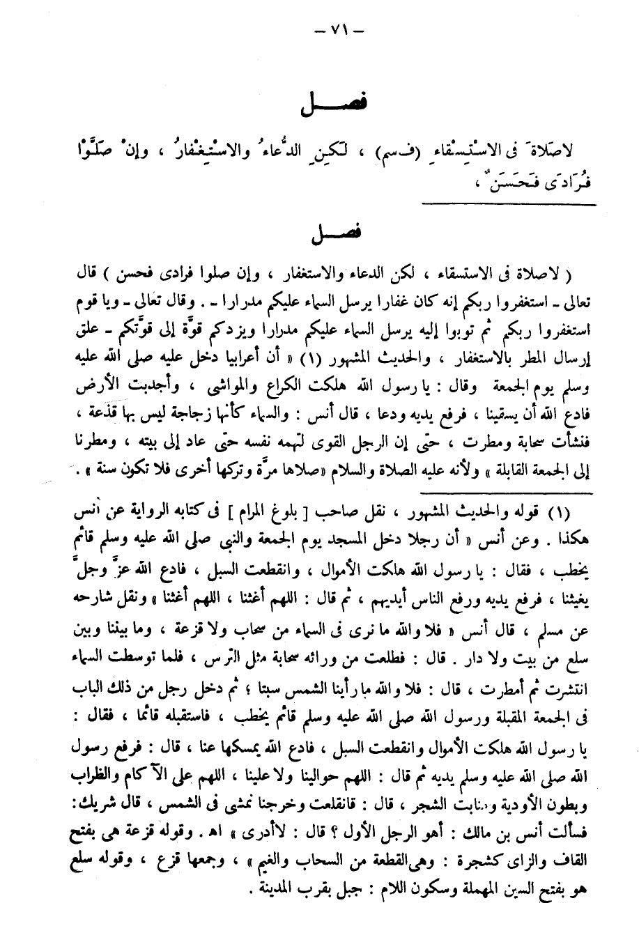 ِ، لَكِنِ الدُّعَاءُ وَالِاسْتِغْفَارُ، وَإِنْ صَلَّوْا فُرَادَى فَحَسَنٌ) قَالَ تَعَالَى: {اسْتَغْفِرُوا رَبَّكُمْ إِنَّهُ كَانَ غَفَّارًا} [نوح: 10] {يُرْسِلِ السَّمَاءَ عَلَيْكُمْ مِدْرَارًا} [نوح: 11] . وَقَالَ تَعَالَى: {وَيَا قَوْمِ اسْتَغْفِرُوا رَبَّكُمْ ثُمَّ تُوبُوا إِلَيْهِ يُرْسِلِ السَّمَاءَ عَلَيْكُمْ مِدْرَارًا وَيَزِدْكُمْ قُوَّةً إِلَى قُوَّتِكُمْ} [هود: 52] عَلَّقَ إِرْسَالَ الْمَطَرِ بِالِاسْتِغْفَارِ، وَالْحَدِيثُ الْمَشْهُورُ: «أَنَّ أَعْرَابَيًّا دَخَلَ عَلَيْهِ - صَلَّى اللَّهُ عَلَيْهِ وَسَلَّمَ - يَوْمَ الْجُمُعَةِ وَقَالَ: يَا رَسُولَ اللَّهِ هَلَكَتِ الْكُرَاعُ وَالْمَوَاشِي، وَأَجْدَبَتِ الْأَرْضُ فَادْعُ اللَّهَ أَنْ يَسْقِيَنَا، فَرَفَعَ يَدَيْهِ وَدَعَا، قَالَ أَنَسٌ: وَالسَّمَاءُ كَأَنَّهَا زُجَاجَةٌ لَيْسَ بِهَا قَزَعَةٌ، فَنَشَأَتْ سَحَابَةٌ وَمَطَرَتْ، حَتَّى إِنَّ الرَّجُلَ الْقَوِيَّ لَتَهُمُّهُ نَفْسُهُ حَتَّى عَادَ إِلَى بَيْتِهِ، وَمُطِرْنَا إِلَى الْجُمُعَةِ الْقَابِلَةِ» ، وَلِأَنَّهُ - عَلَيْهِ الصَّلَاةُ وَالسَّلَامُ - صَلَّاهَا مَرَةً وَتَرَكَهَا أُخْرَى فَلَا تَكُونُ سُنَّةً.