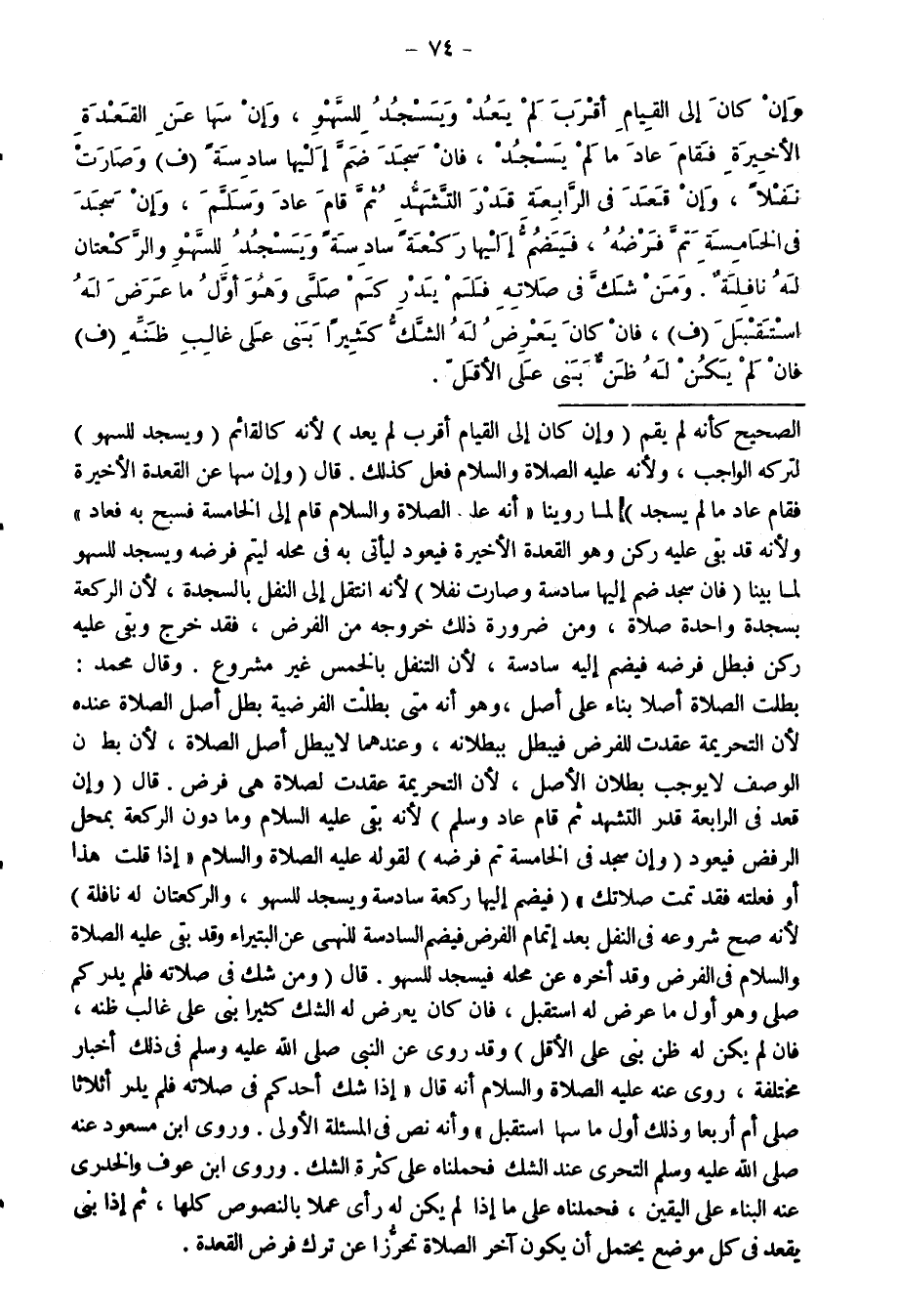 وَإِنْ كَانَ إِلَى الْقِيَامِ أَقْرَبَ لَمْ يَعُدْ وَيَسْجُدُ لِلسَّهْوِ، وَإِنْ سَهَا عَنِ الْقَعْدَةِ الْأَخِيرَةِ فَقَامَ عَادَ مَا لَمْ يَسْجُدْ، فَإِنْ سَجَدَ ضَمَّ إِلَيْهَا سَادِسَةً (ف) وَصَارَتْ نَفْلًا، وَإِنْ قَعَدَ فِي الرَّابِعَةِ قَدْرَ التَّشَهُّدِ ثُمَّ قَامَ عَادَ وَسَلَّمَ، وَإِنْ سَجَدَ فِي الْخَامِسَةِ تَمَّ فَرْضُهُ، فَيَضُمُّ إِلَيْهَا رَكْعَةً سَادِسَةً وَيَسْجُدُ لِلسَّهُوِ وَالرَّكْعَتَانِ لَهُ نَافِلَةٌ. وَمَنْ شَكَّ فِي صَلَاتِهِ فَلَمْ يَدْرِ كَمْ صَلَّى وَهُوَ أَوَّلُ مَا عَرَضَ لَهُ اسْتَقْبَلَ (ف) ، فَإِنْ كَانَ يَعْرِضُ لَهُ الشَّكُّ كَثِيرًا بَنَى عَلَى غَالِبِ ظَنِّهِ (ف) فَإِنْ لَمْ يَكُنْ لَهُ ظَنٌّ بَنَى عَلَى الْأَقَلِّ.