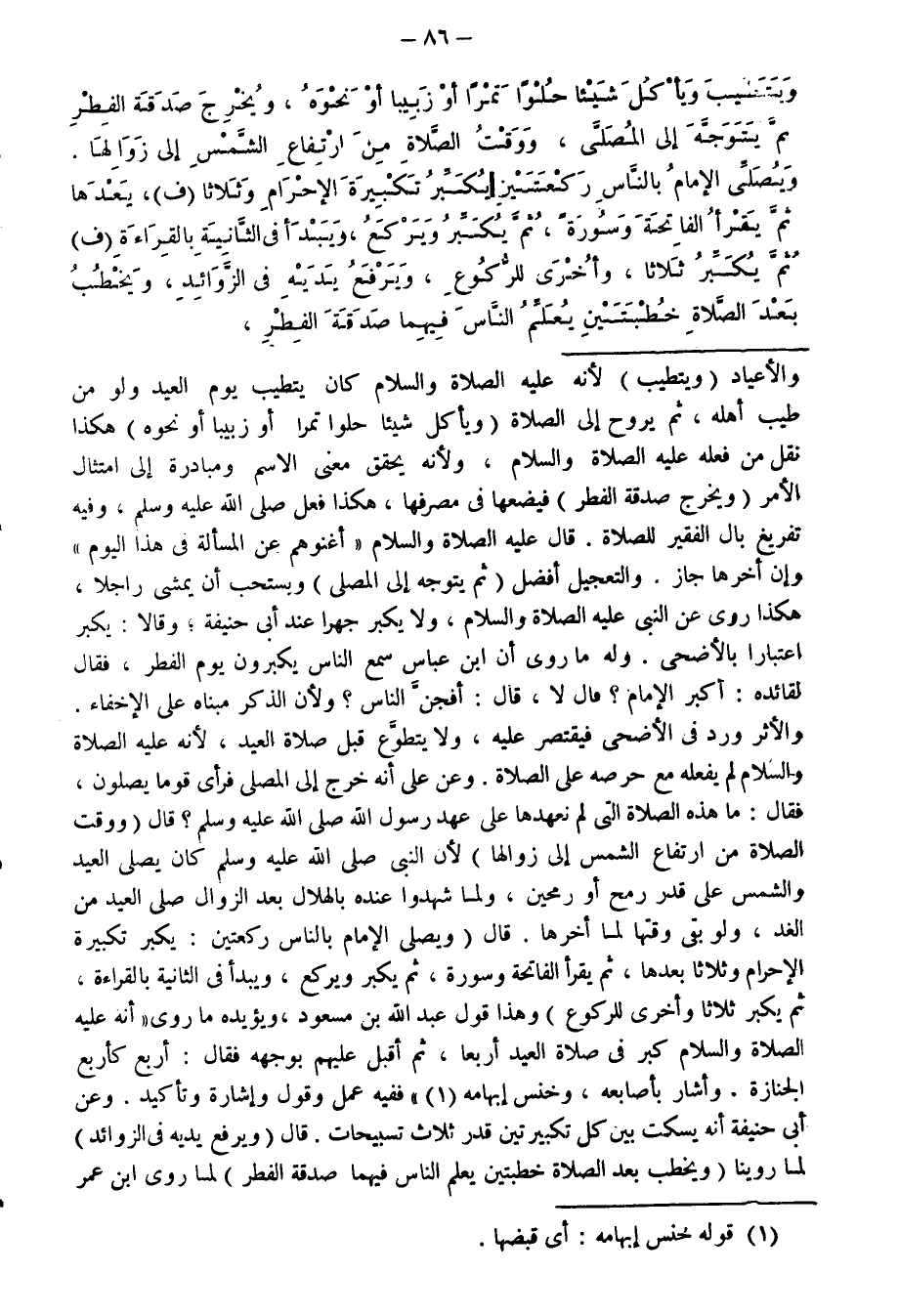 وَيَتَطَيَّبَ وَيَأْكُلَ شَيْئًا حُلْوًا تَمْرًا أَوْ زَبِيبًا أَوْ نَحْوَهُ، وَيُخْرِجَ صَدَقَةَ الْفِطْرِ ثُمَّ يَتَوَجَّهَ إِلَى الْمُصَلَّى، وَوَقْتُ الصَّلَاةِ مِنِ ارْتِفَاعِ الشَّمْسِ إِلَى زَوَالِهَا. وَيُصَلِّي الْإِمَامُ بِالنَّاسِ رَكْعَتَيْنِ يُكَبِّرُ تَكْبِيرَةَ الْإِحْرَامِ وَثَلَاثًا (ف) ، بَعْدَهَا ثُمَّ يَقْرَأُ الْفَاتِحَةَ وَسُورَةً، ثُمَّ يُكَبِّرُ وَيَرْكَعُ، وَيَبْدَأَ فِي الثَّانِيَةِ بِالْقِرَاءَةِ (ف) ثُمَّ يُكَبِّرُ ثَلَاثًا، وَأُخْرَى لِلرُّكُوعِ وَيَرْفَعُ يَدَيْهِ فِي الزَّوَائِدِ، وَيَخْطُبُ بَعْدَ الصَّلَاةِ خُطْبَتَيْنِ يُعَلِّمُ النَّاسَ فِيهِمَا صَدَقَةَ الْفِطْرِ،