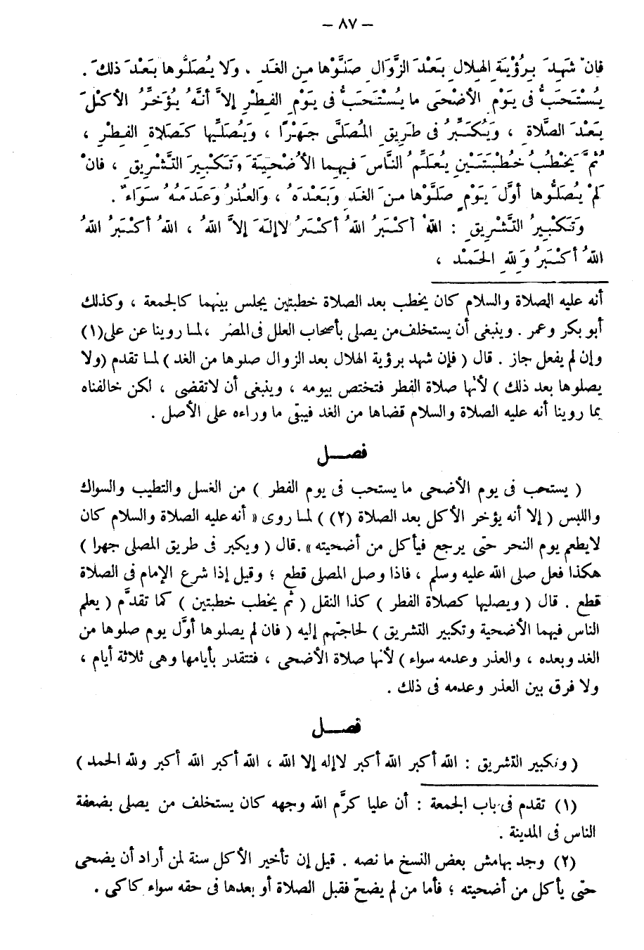 يُسْتَحَبُّ فِي يَوْمِ الْأَضْحَى مَا يُسْتَحَبُّ فِي يَوْمِ الْفِطْرِ إِلَّا أَنَّهُ يُؤَخِّرُ الْأَكْلَ بَعْدَ الصَّلَاةِ، وَيُكَبِّرُ فِي طَرِيقِ الْمُصَلَّى جَهْرًا، وَيُصَلِّيهَا كَصَلَاةِ الْفِطْرِ، ثُمَّ يَخْطُبُ خُطْبَتَيْنِ يُعَلِّمُ النَّاسَ فِيهِمَا الْأُضْحِيَةَ وَتَكْبِيرَ التَّشْرِيقِ، فَإِنْ لَمْ يُصَلُّوهَا أَوَّلَ يَوْمٍ صَلَّوْهَا مِنَ الْغَدِ وَبَعْدَهُ، وَالْعُذْرُ وَعَدَمُهُ سَوَاءٌ.