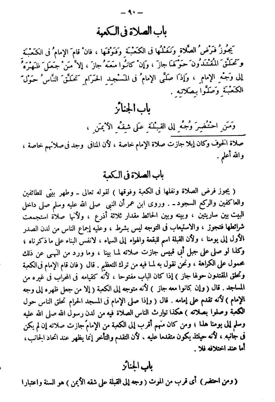 يَجُوزُ فَرْضُ الصَّلَاةِ وَنَفْلُهَا فِي الْكَعْبَةِ وَفَوْقَهَا، فَإِنْ قَامَ الْإِمَامُ فِي الْكَعْبَةِ وَتَحَلَّقَ الْمُقْتَدُونَ حَوْلَهَا جَازَ، وَإِنْ كَانُوا مَعَهُ جَازَ، إِلَّا مَنْ جَعَلَ ظَهْرَهُ إِلَى وَجْهِ الْإِمَامِ، وَإِذَا صَلَّى الْإِمَامُ فِي الْمَسْجِدِ الْحَرَامِ تَحَلَّقَ النَّاسُ حَوْلَ الْكَعْبَةِ وَصَلَّوْا بِصَلَاتِهِ.