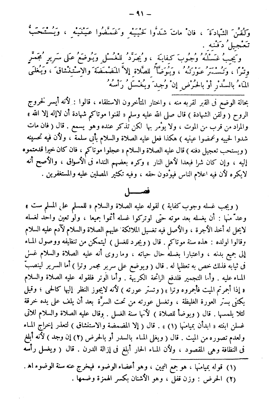 وَيَجِبُ غَسْلُهُ وُجُوبَ كِفَايَةٍ، وَيُجَرَّدُ لِلْغُسْلِ وَيُوضَعُ عَلَى سَرِيرٍ مُجَمَّرٍ وِتْرًا، وَتُسْتَرُ عَوْرَتُهُ، وَيُوَضَّأُ لِلصَّلَاةِ إِلَّا الْمَضْمَضَةَ وَالِاسْتِنْشَاقَ، وَيُغْلَى الْمَاءُ بِالسِّدْرِ أَوْ بِالْحُرْضِ إِنْ وُجِدَ وَيُغْسَلُ رَأْسُهُ