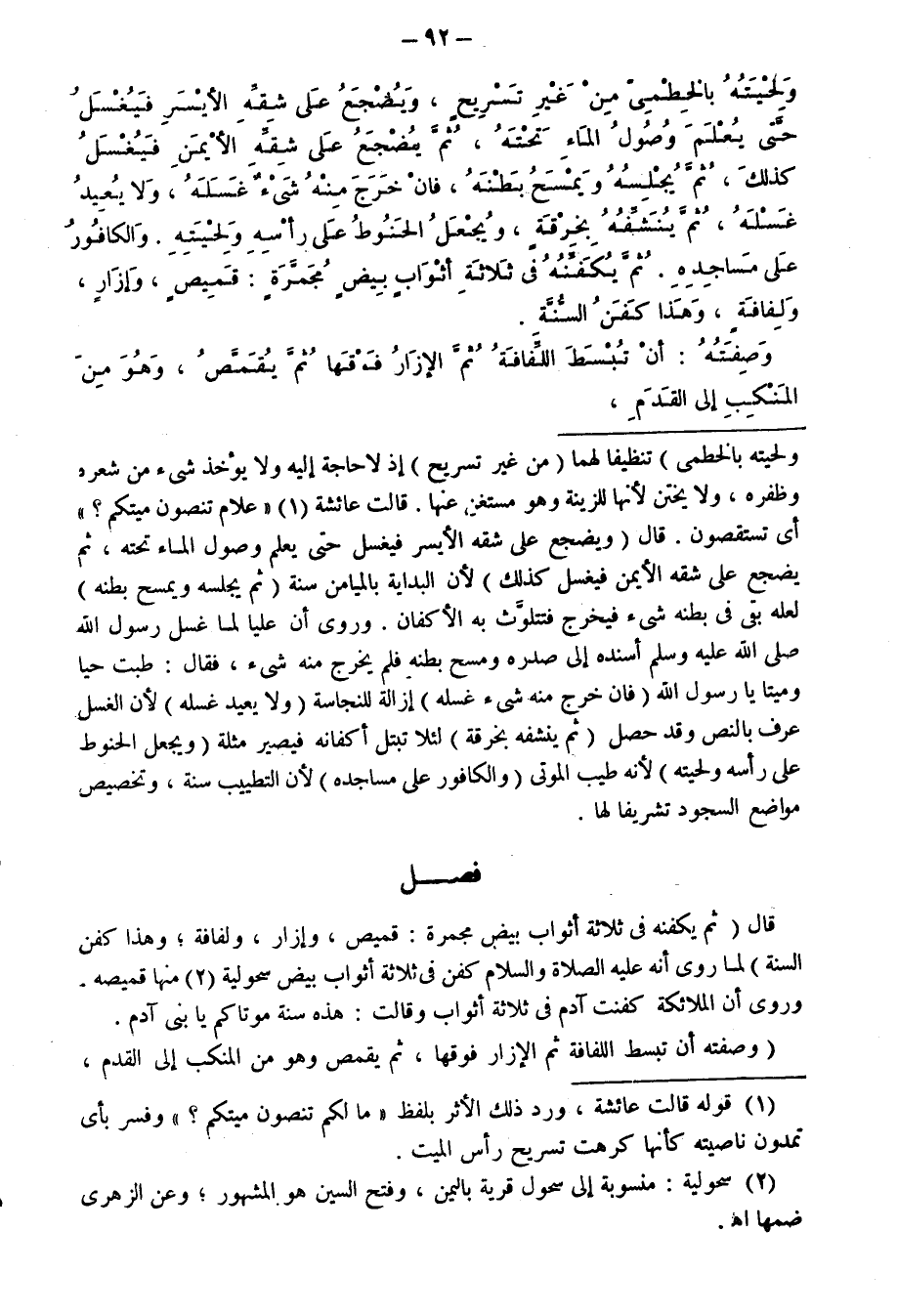 فَصْلٌ قَالَ: (ثُمَّ يُكَفِّنُهُ فِي ثَلَاثَةِ أَثْوَابٍ بِيضٍ مَجْمَّرَةٍ: قَمِيصٍ، وَإِزَارٍ، وَلِفَافَةٍ ; وَهَذَا كَفَنُ السُّنَّةِ) لِمَا «رُوِيَ أَنَّهُ - عَلَيْهِ الصَّلَاةُ وَالسَّلَامُ - كُفِّنَ فِي ثَلَاثَةِ أَثْوَابٍ بِيضٍ سُحُولِيَّةٍ مِنْهَا قَمِيصُهُ» . «وَرُوِيَ أَنَّ الْمَلَائِكَةَ كَفَّنَتْ آدَمَ فِي ثَلَاثَةِ أَثْوَابٍ، وَقَالَتْ: هَذِهِ سُنَّةُ مَوْتَاكُمْ يَا بَنِي آدَمَ» .