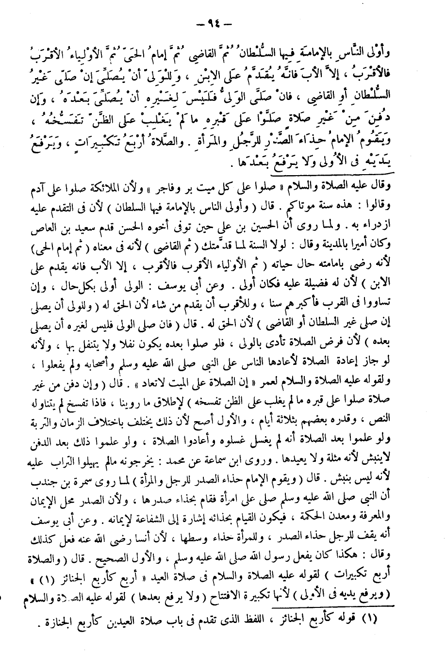 وَأَوْلَى النَّاسِ بِالْإِمَامَةِ فِيهَا السُّلْطَانُ، ثُمَّ الْقَاضِي، ثُمَّ إِمَامُ الْحَيِّ، ثُمَّ الْأَوْلِيَاءُ الْأَقْرَبُ فَالْأَقْرَبُ، إِلَّا الْأَبَ فَإِنَّهُ يُقَدَّمُ عَلَى الِابْنِ، وَلِلْوَلِيِّ أَنْ يُصَلِّيَ إِنْ صَلَّى غَيْرُ السُّلْطَانِ أَوِ الْقَاضِي، فَإِنْ صَلَّى الْوَلِيُّ فَلَيْسَ لِغَيْرِهِ أَنْ يُصَلِّيَ بَعْدَهُ، وَإِنْ دُفِنَ مِنْ غَيْرِ صَلَاةٍ صَلَّوْا عَلَى قَبْرِهِ مَا لَمْ يَغْلِبْ عَلَى الظَّنِّ تَفَسُّخُهُ، وَيَقُومُ الْإِمَامُ حِذَاءَ الصَّدْرِ لِلرَّجُلِ وَالْمَرْأَةِ. وَالصَّلَاةُ أَرْبَعُ تَكْبِيرَاتٍ، وَيَرْفَعُ يَدَيْهِ فِي الْأُولَى وَلَا يَرْفَعُ بَعْدَهَا.