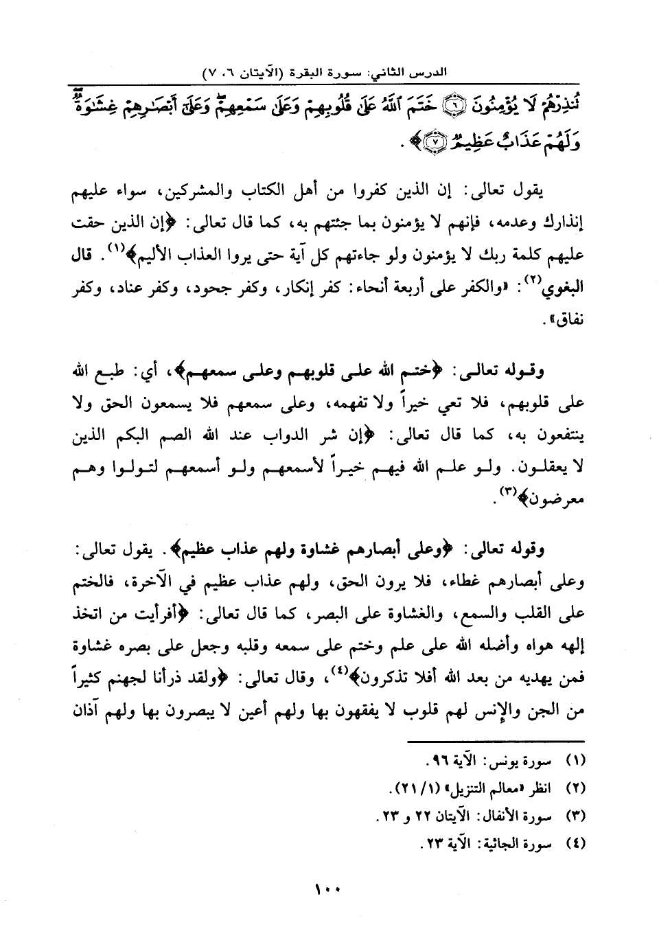 تُنذِرْهُمْ لاَ يُؤْمِنُونَ (6) خَتَمَ اللهُ عَلَى قُلُوبِهمْ وَعَلَى سَمْعِهِمْ وَعَلَى أَبْصَارِهِمْ غِشَاوَةٌ وَلَهُمْ عَذَابٌ عظِيمٌ (7) } .
