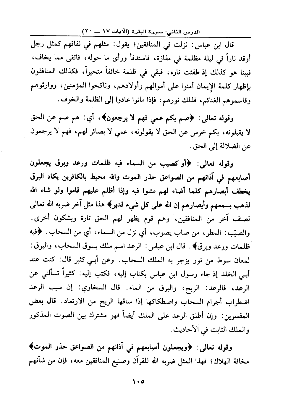 وقوله تعالى: {أَوْ كَصَيِّبٍ مِّنَ السَّمَاءِ فِيهِ ظُلُمَاتٌ وَرَعْدٌ وَبَرْقٌ يَجْعَلُونَ أَصْابِعَهُمْ فِي آذَانِهِم مِّنَ الصَّوَاعِقِ حَذَرَ الْمَوْتِ واللهُ مُحِيطٌ بِالْكافِرِينَ * يَكَادُ الْبَرْقُ يَخْطَفُ أَبْصَارَهُمْ كُلَّمَا أَضَاء لَهُم مَّشَوْاْ فِيهِ وَإِذَا أَظْلَمَ عَلَيْهِمْ قَامُواْ وَلَوْ شَاء اللهُ لَذَهَبَ بِسَمْعِهِمْ وَأَبْصَارِهِمْ إِنَّ اللَّه عَلَى كُلِّ شَيْءٍ قَدِيرٌ} هذا مثل آخر ضربه الله تعالى لصنف آخر من المنافقين، وهم قوم يظهر لهم الحق تارة ويشكون أخرى. والصيّب: المطر، من صاب يصوب، أي: نزل من السماء، أي: من السحاب، {فِيهِ ظُلُمَاتٌ وَرَعْدٌ وَبَرْقٌ} . قال ابن عباس: الرعد: اسم ملك يسوق السحاب، والبرق: لمعان سوط من نور يزجر به الملك السحاب. وعن أبي كثير قال: كنت عند أبي الخلد إذ جاء رسول ابن عباس بكتاب ... إليه، فكتب إليه: كثيرًا تسألني عن الرعد، فالرعد: الريح، والبرق من الماء. قال السخاوي: إن سبب الرعد اضطراب أجرام السحاب