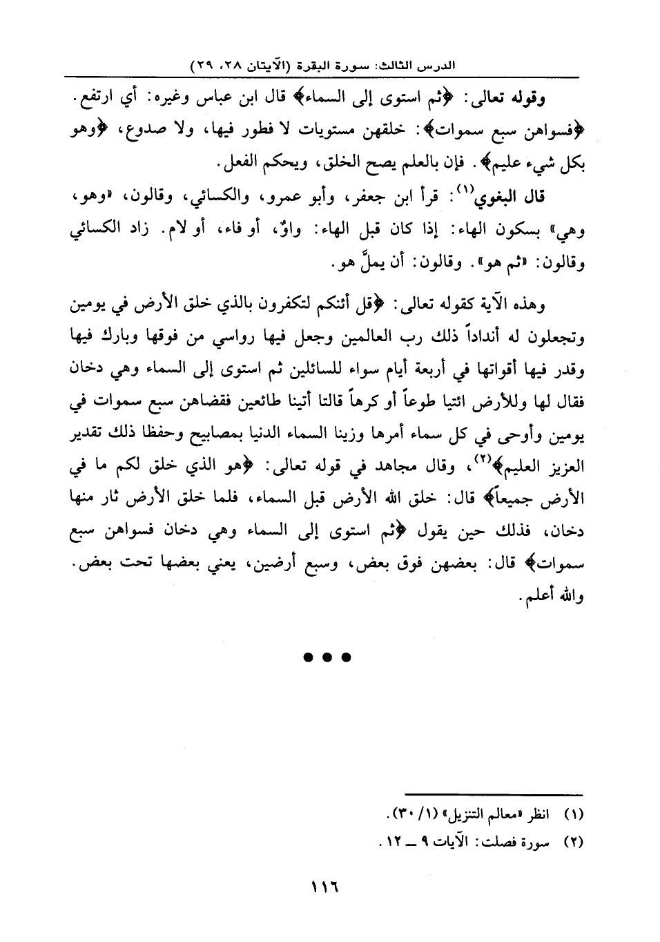 وقوله تعالى: {ثُمَّ اسْتَوَى إِلَى السَّمَاء} قال ابن عباس وغيره: أي ارتفع، {فَسَوَّاهُنَّ سَبْعَ سَمَاوَاتٍ} : خلقهن مستويات لا فطور فيها،