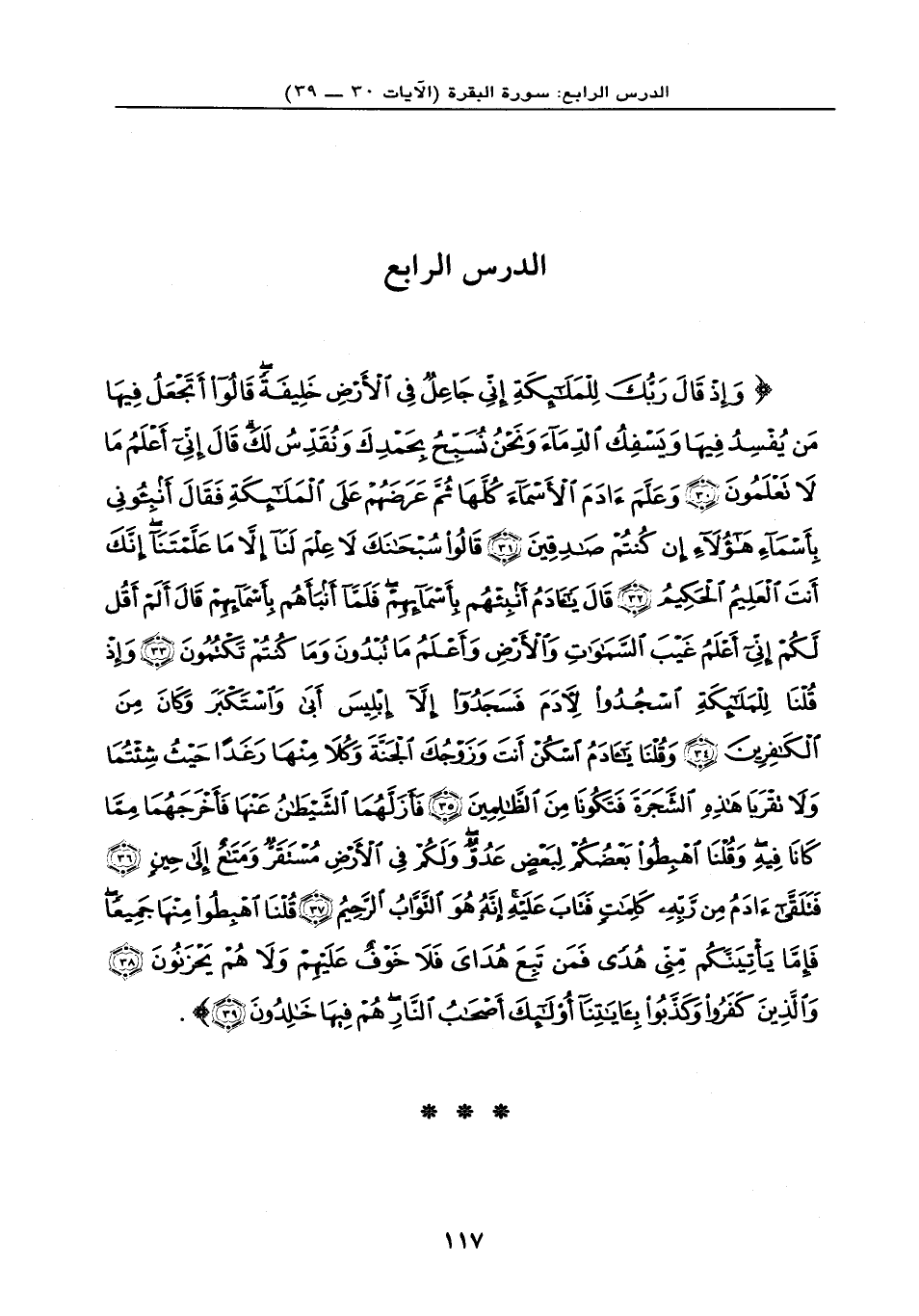 ... {وَإِذْ قَالَ رَبُّكَ لِلْمَلاَئِكَةِ إِنِّي جَاعِلٌ فِي الأَرْضِ خَلِيفَةً قَالُواْ أَتَجْعَلُ فِيهَا مَن يُفْسِدُ فِيهَا وَيَسْفِكُ الدِّمَاء وَنَحْنُ نُسَبِّحُ بِحَمْدِكَ وَنُقَدِّسُ لَكَ قَالَ إِنِّي أَعْلَمُ مَا لاَ تَعْلَمُونَ (30) وَعَلَّمَ آدَمَ الأَسْمَاء كُلَّهَا ثُمَّ عَرَضَهُمْ عَلَى الْمَلاَئِكَةِ فَقَالَ أَنبِئُونِي بِأَسْمَاء هَؤُلاء إِن كُنتُمْ صَادِقِينَ (31) قَالُواْ سُبْحَانَكَ لاَ عِلْمَ لَنَا إِلا مَا عَلَّمْتَنَا إِنَّكَ أَنتَ الْعَلِيمُ الْحَكِيمُ (32) قَالَ يَا آدَمُ أَنبِئْهُم بِأَسْمَآئِهِمْ فَلَمَّا أَنبَأَهُمْ بِأَسْمَآئِهِمْ قَالَ أَلَمْ أَقُل لَّكُمْ إِنِّي أَعْلَمُ غَيْبَ السَّمَاوَاتِ وَالأَرْضِ وَأَعْلَمُ مَا تُبْدُونَ وَمَا كُنتُمْ تَكْتُمُونَ (33) وَإِذْ قُلْنَا لِلْمَلاَئِكَةِ اسْجُدُواْ لآدَمَ فَسَجَدُواْ إِلا إِبْلِيسَ أَبَى وَاسْتَكْبَرَ وَكَانَ مِنَ الْكَافِرِينَ (34) وَقُلْنَا يَا آدَمُ اسْكُنْ أَنتَ وَزَوْجُكَ الْجَنَّةَ وَكُلاَ مِنْهَا رَغَداً حَيْثُ شِئْتُمَا وَلاَ تَقْرَبَا هَذِهِ الشَّجَرَةَ فَتَكُونَا مِنَ الْظَّالِمِينَ (35) فَأَزَلَّهُمَا الشَّيْطَانُ عَنْهَا فَأَخْرَجَهُمَا مِمَّا كَانَا فِيهِ وَقُلْنَا اهْبِطُواْ بَعْضُكُمْ لِبَعْضٍ عَدُوٌّ وَلَكُمْ فِي الأَرْضِ مُسْتَقَرٌّ وَمَتَاعٌ إِلَى حِينٍ (36) فَتَلَقَّى آدَمُ مِن رَّبِّهِ كَلِمَاتٍ فَتَابَ عَلَيْهِ إِنَّهُ هُوَ التَّوَّابُ الرَّحِيمُ (37) قُلْنَا اهْبِطُواْ مِنْهَا جَمِيعاً فَإِمَّا يَأْتِيَنَّكُم مِّنِّي هُدًى فَمَن تَبِعَ هُدَايَ فَلاَ خَوْفٌ عَلَيْهِمْ وَلاَ هُمْ يَحْزَنُونَ (38) وَالَّذِينَ كَفَرواْ وَكَذَّبُواْ بِآيَاتِنَا أُولَئِكَ أَصْحَابُ النَّارِ هُمْ فِيهَا خَالِدُونَ (39) } .