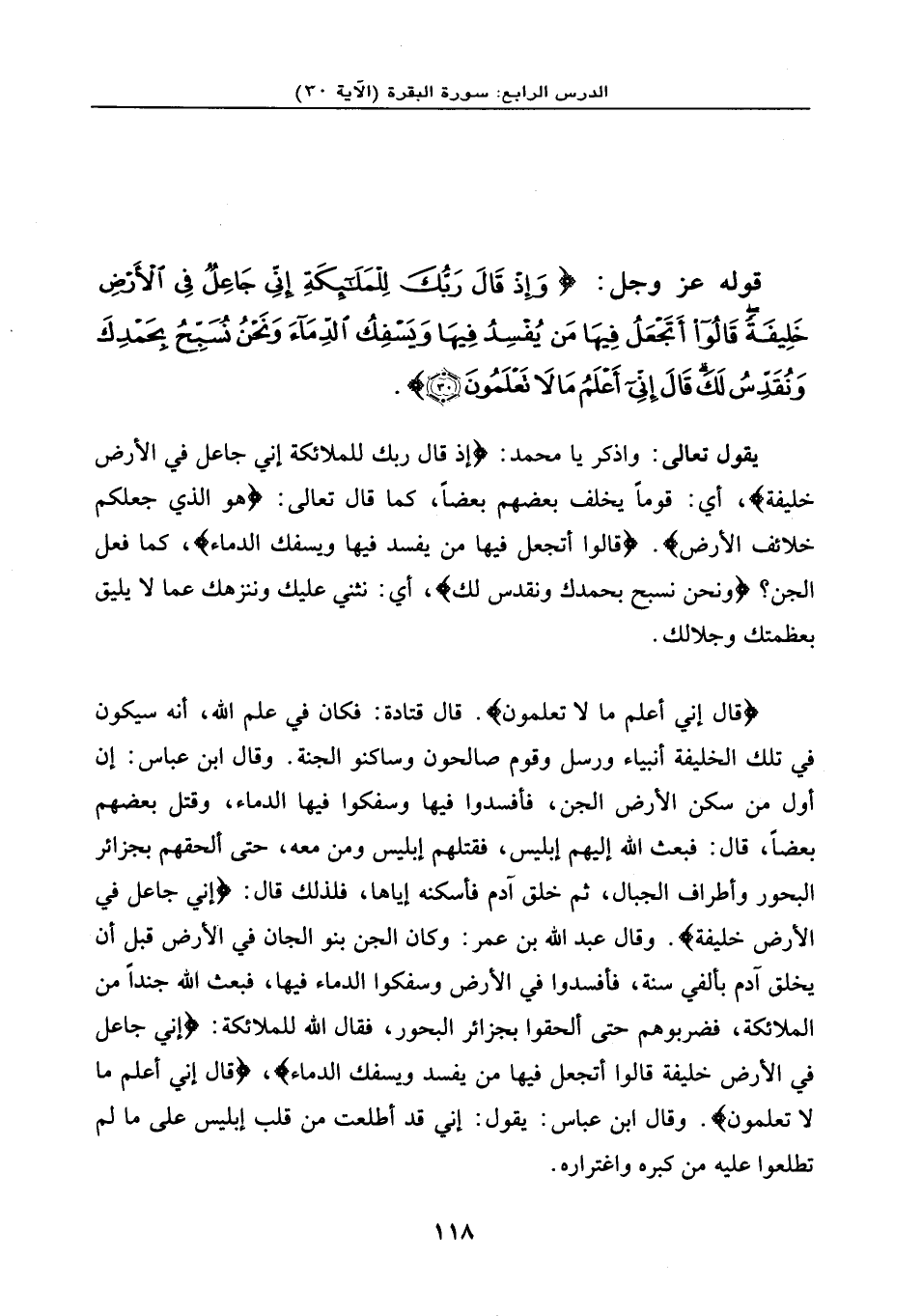 قوله عز وجل: {وَإِذْ قَالَ رَبُّكَ لِلْمَلاَئِكَةِ إِنِّي جَاعِلٌ فِي الأَرْضِ خَلِيفَةً قَالُواْ أَتَجْعَلُ فِيهَا مَن يُفْسِدُ فِيهَا وَيَسْفِكُ الدِّمَاء وَنَحْنُ نُسَبِّحُ بِحَمْدِكَ وَنُقَدِّسُ لَكَ قَالَ إِنِّي أَعْلَمُ مَا لاَ تَعْلَمُونَ (30) } .