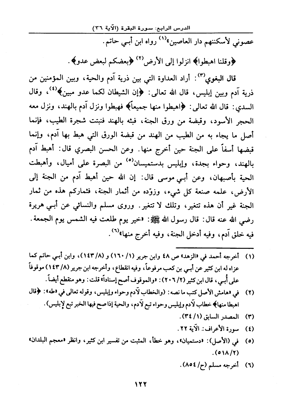 قال البغوي: أراد العداوة التي بين ذرية آدم، والحية، وبين المؤمنين من ذرية آدم، وبين إبليس، قال الله تعالى: {إِنَّ الشَّيْطَآنَ لَكُمَا عَدُوٌّ مُّبِينٌ} ، وقال السدي: قال الله تعالى: {اهْبِطُواْ مِنْهَا جَمِيعاً} فهبطوا ونزل آدم بالهند، ونزل معه الحجر الأسود، وقبضة من ورق الجنة، فبثه بالهند فنبتت شجرة الطيب، فإنما أصل ما يجاء به من الطيب من الهند من قبضة الورق التي هبط بها آدم، وإنما قبضها أسفًا على الجنة حين أخرج منها.