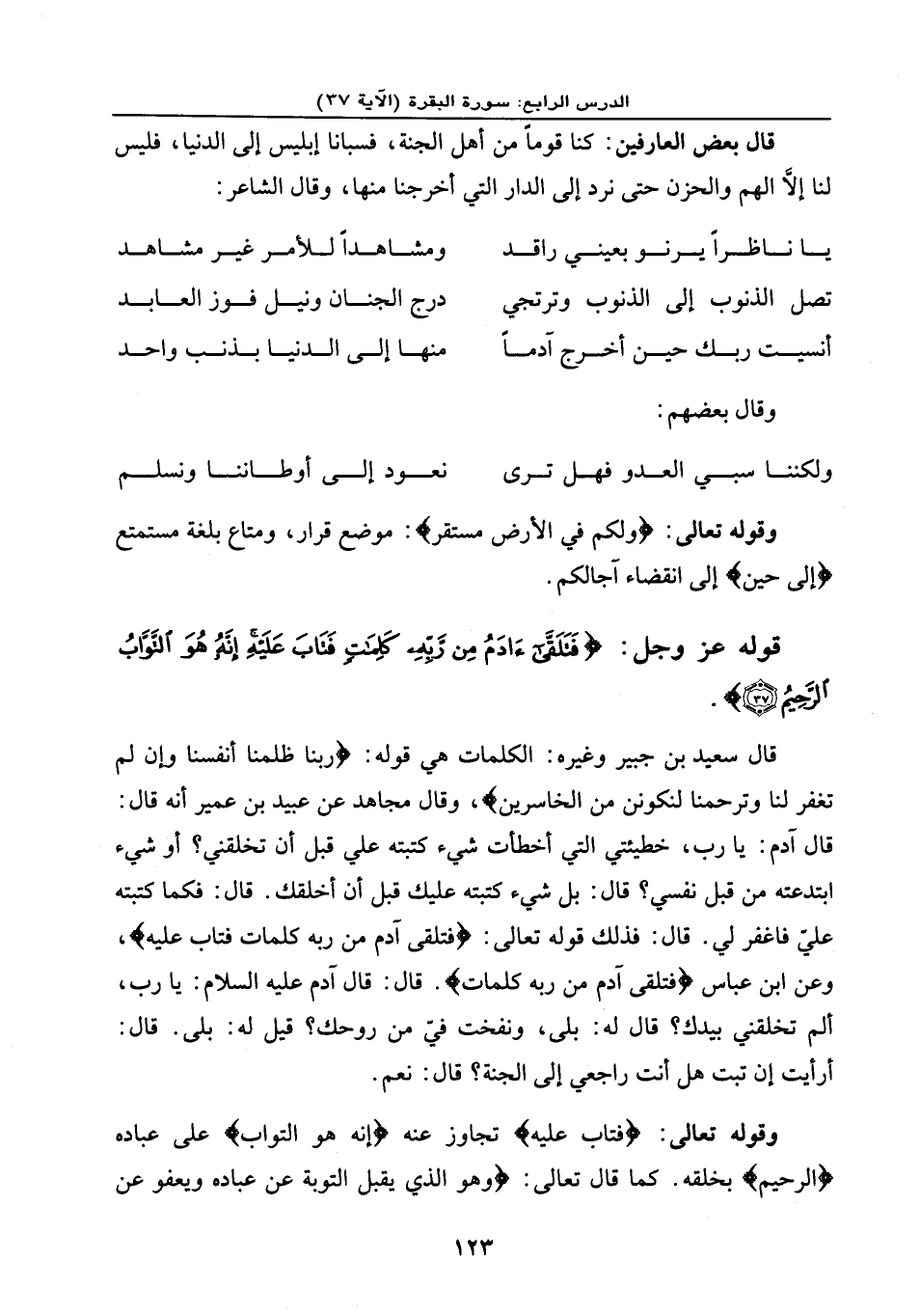 قوله عز وجل: {فَتَلَقَّى آدَمُ مِن رَّبِّهِ كَلِمَاتٍ فَتَابَ عَلَيْهِ إِنَّهُ هُوَ التَّوَّابُ الرَّحِيمُ (37) } .