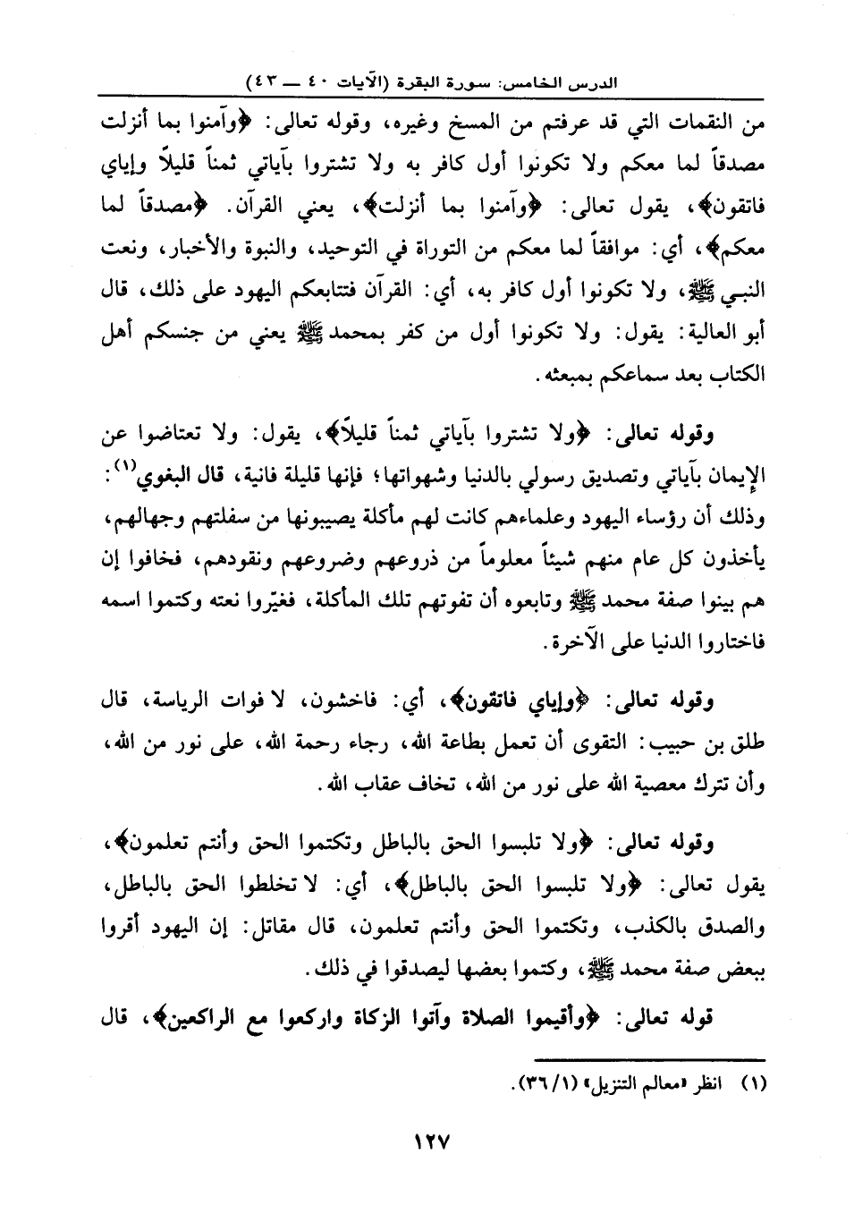 وقوله تعالى: {وَلاَ تَشْتَرُواْ بِآيَاتِي ثَمَناً قَلِيلاً} ، يقول: ولا تعتاضوا عن الإيمان بآياتي وتصديق رسولي بالدنيا وشهواتها؛ فإنها قليلة فانية، قال البغوي: وذلك أن رؤساء اليهود وعلماءهم كانت لهم مأكلة يصيبونها من سفلتهم وجهالهم، يأخذون كل عام منهم شيئًا معلومًا من ذروعهم وضروعهم ونقودهم، فخافوا إن هم بينوا صفة محمد - صلى الله عليه وسلم - وتابعوه أن تفوتهم تلك المأكلة، فغيّروا نعته وكتموا اسمه فاختاروا الدنيا على الآخرة.