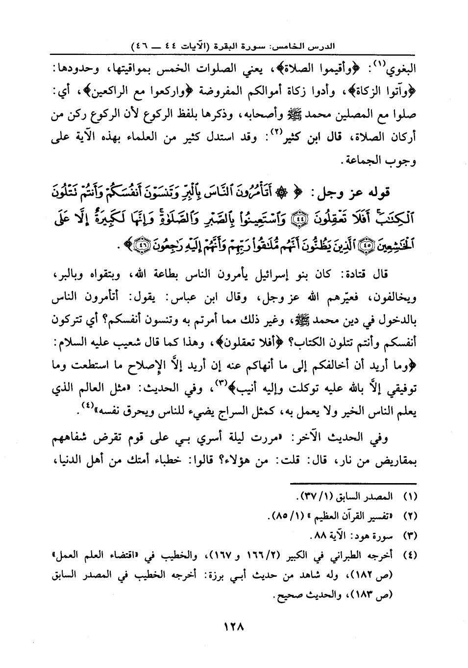 قوله عز وجل: {أَتَأْمُرُونَ النَّاسَ بِالْبِرِّ وَتَنسَوْنَ أَنفُسَكُمْ وَأَنتُمْ تَتْلُونَ الْكِتَابَ أَفَلاَ تَعْقِلُونَ (44) وَاسْتَعِينُواْ بِالصَّبْرِ وَالصَّلاَةِ وَإِنَّهَا لَكَبِيرَةٌ إِلا عَلَى الْخَاشِعِينَ (45) الَّذِينَ يَظُنُّونَ أَنَّهُم مُّلاَقُوا رَبِّهِمْ وَأَنَّهُمْ إِلَيْهِ رَاجِعُونَ (46) } .