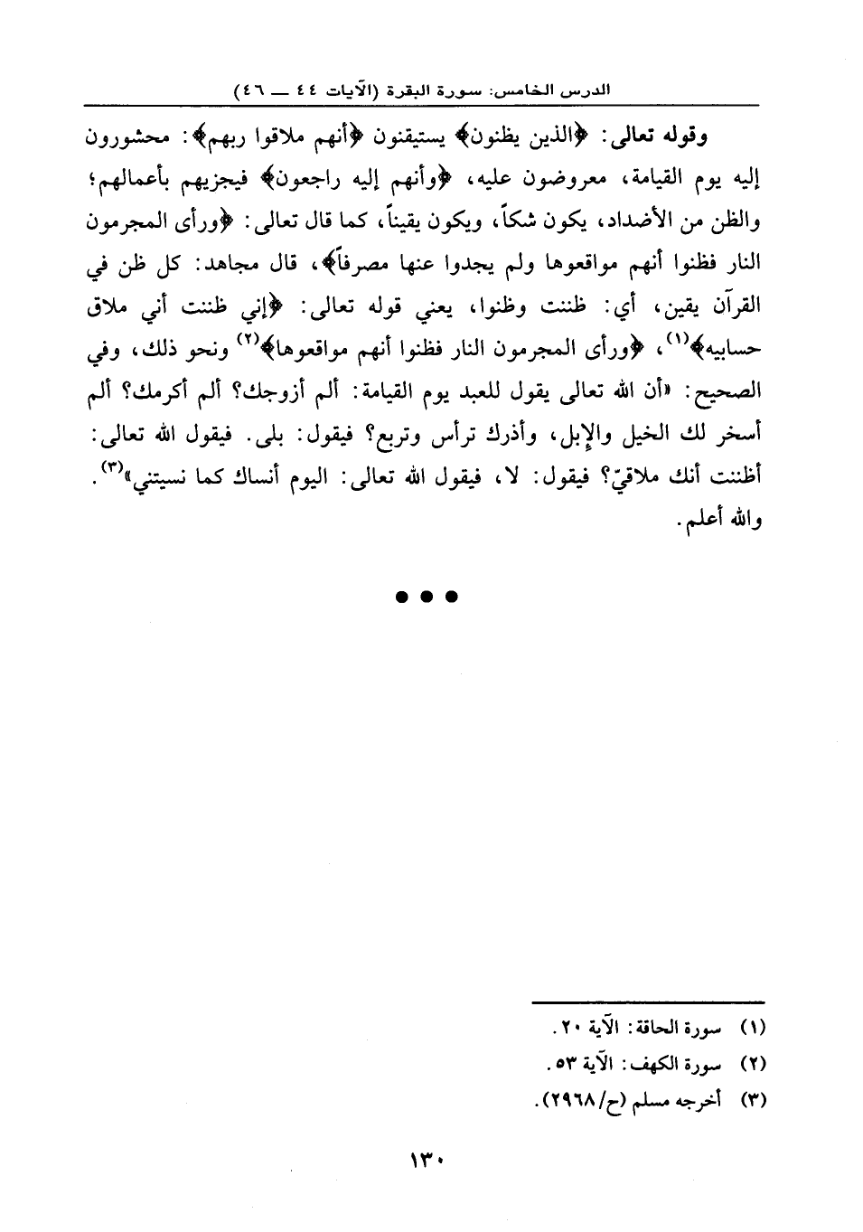 وقوله تعالى: {الَّذِينَ يَظُنُّونَ} يستيقنون {أَنَّهُم مُّلاَقُوا رَبِّهِمْ} : محشورون إليه يوم القيامة، معروضون عليه، {وَأَنَّهُمْ إِلَيْهِ رَاجِعُونَ}