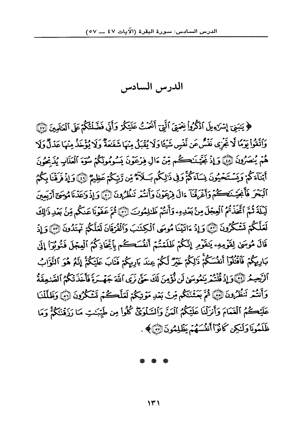 {يَا بَنِي إِسْرَائِيلَ اذْكُرُواْ نِعْمَتِيَ الَّتِي أَنْعَمْتُ عَلَيْكُمْ وَأَنِّي فَضَّلْتُكُمْ عَلَى الْعَالَمِينَ (47) وَاتَّقُواْ يَوْماً لا تَجْزِي نَفْسٌ عَن نَّفْسٍ شَيْئاً وَلاَ يُقْبَلُ مِنْهَا شَفَاعَةٌ وَلاَ يُؤْخَذُ مِنْهَا عَدْلٌ وَلاَ هُمْ يُنصَرُونَ (48) وَإِذْ نَجَّيْنَاكُم مِّنْ آلِ فِرْعَوْنَ يَسُومُونَكُمْ سُوَءَ الْعَذَابِ يُذَبِّحُونَ أَبْنَاءكُمْ وَيَسْتَحْيُونَ نِسَاءكُمْ وَفِي ذَلِكُم بَلاءٌ مِّن رَّبِّكُمْ عَظِيمٌ (49) وَإِذْ فَرَقْنَا بِكُمُ الْبَحْرَ فَأَنجَيْنَاكُمْ وَأَغْرَقْنَا آلَ فِرْعَوْنَ وَأَنتُمْ تَنظُرُونَ (50) وَإِذْ وَاعَدْنَا مُوسَى أَرْبَعِينَ لَيْلَةً ثُمَّ اتَّخَذْتُمُ الْعِجْلَ مِن بَعْدِهِ وَأَنتُمْ ظَالِمُونَ (51) ثُمَّ عَفَوْنَا عَنكُمِ مِّن بَعْدِ ذَلِكَ لَعَلَّكُمْ تَشْكُرُونَ (52) وَإِذْ آتَيْنَا مُوسَى الْكِتَابَ وَالْفُرْقَانَ لَعَلَّكُمْ تَهْتَدُونَ (53) وَإِذْ قَالَ مُوسَى لِقَوْمِهِ يَا قَوْمِ إِنَّكُمْ ظَلَمْتُمْ أَنفُسَكُمْ بِاتِّخَاذِكُمُ الْعِجْلَ فَتُوبُواْ إِلَى بَارِئِكُمْ فَاقْتُلُواْ أَنفُسَكُمْ ذَلِكُمْ خَيْرٌ لَّكُمْ عِندَ بَارِئِكُمْ فَتَابَ عَلَيْكُمْ إِنَّهُ هُوَ التَّوَّابُ الرَّحِيمُ (54) وَإِذْ قُلْتُمْ يَا مُوسَى لَن نُّؤْمِنَ لَكَ حَتَّى نَرَى اللَّهَ جَهْرَةً فَأَخَذَتْكُمُ الصَّاعِقَةُ وَأَنتُمْ تَنظُرُونَ (55) ثُمَّ بَعَثْنَاكُم مِّن بَعْدِ مَوْتِكُمْ لَعَلَّكُمْ تَشْكُرُونَ (56) وَظَلَّلْنَا عَلَيْكُمُ الْغَمَامَ وَأَنزَلْنَا عَلَيْكُمُ الْمَنَّ وَالسَّلْوَى كُلُواْ مِن طَيِّبَاتِ مَا رَزَقْنَاكُمْ وَمَا ظَلَمُونَا وَلَكِن كَانُواْ أَنفُسَهُمْ يَظْلِمُونَ (57) } .