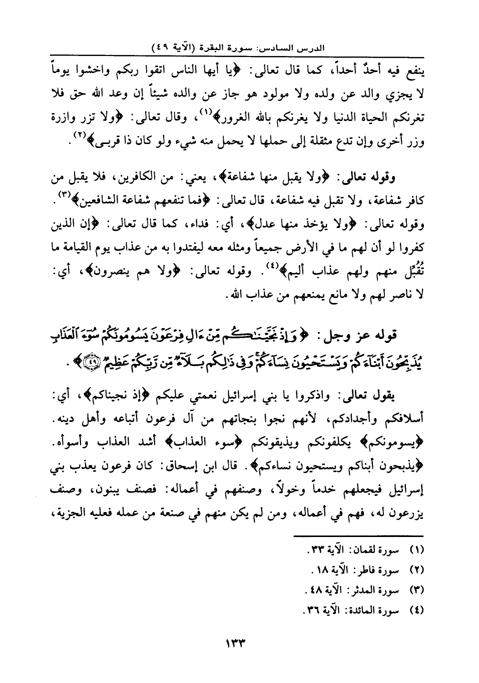 قوله عز وجل: {وَإِذْ نَجَّيْنَاكُم مِّنْ آلِ فِرْعَوْنَ يَسُومُونَكُمْ سُوَءَ الْعَذَابِ يُذَبِّحُونَ أَبْنَاءكُمْ وَيَسْتَحْيُونَ نِسَاءكُمْ وَفِي ذَلِكُم بَلاءٌ مِّن رَّبِّكُمْ عَظِيمٌ (49) } .