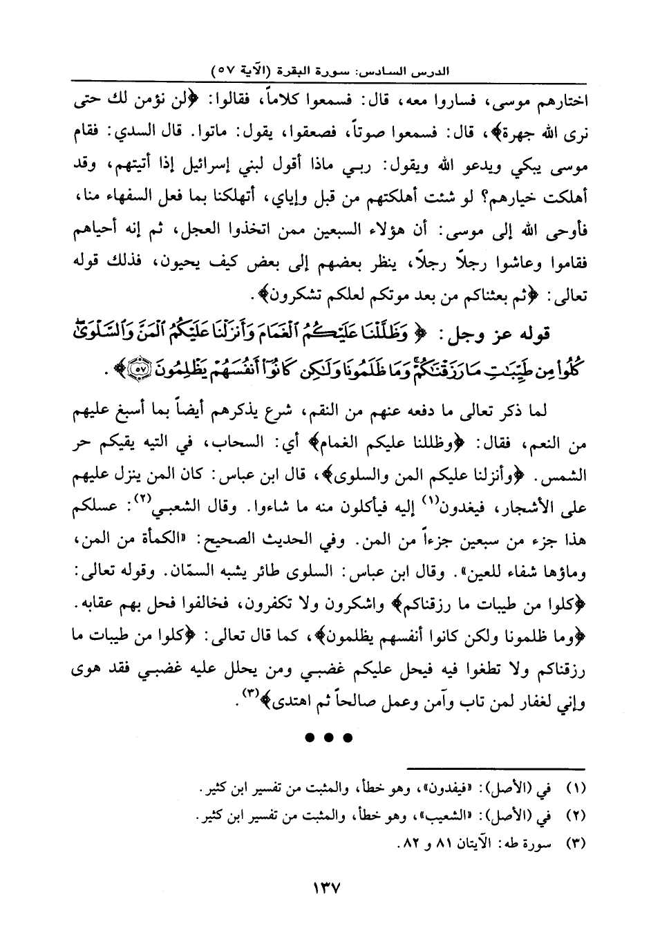 قوله عز وجل: {وَظَلَّلْنَا عَلَيْكُمُ الْغَمَامَ وَأَنزَلْنَا عَلَيْكُمُ الْمَنَّ وَالسَّلْوَى كُلُواْ مِن طَيِّبَاتِ مَا رَزَقْنَاكُمْ وَمَا ظَلَمُونَا وَلَكِن كَانُواْ أَنفُسَهُمْ يَظْلِمُونَ (57) } .