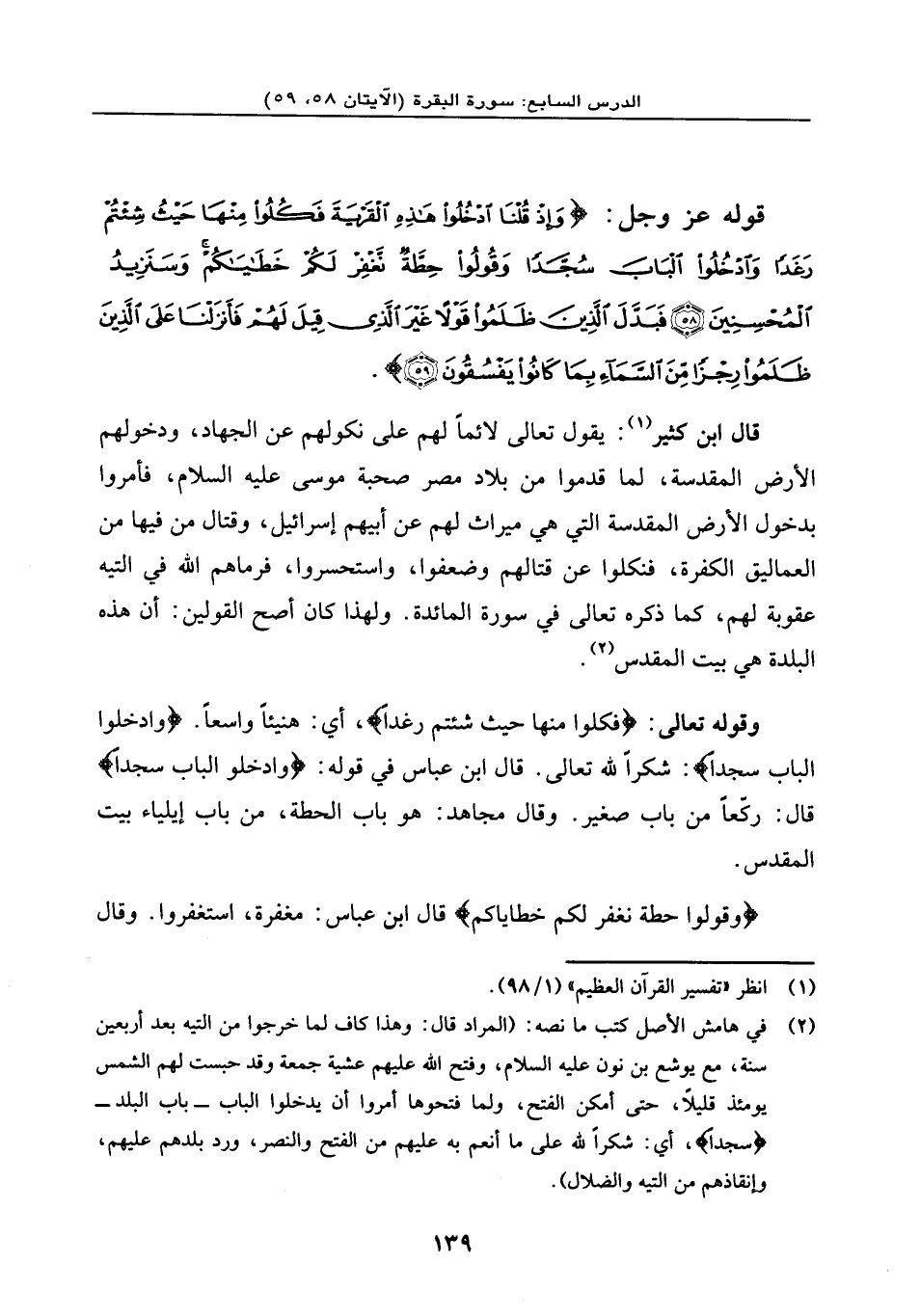 وقوله تعالى: {فَكُلُواْ مِنْهَا حَيْثُ شِئْتُمْ رَغَداً} ، أي: هنيئاً واسعاً. {وَادْخُلُواْ الْبَابَ سُجَّداً} : شكرًا لله تعالى. قال ابن عباس في قوله: {وَادْخُلُواْ الْبَابَ سُجَّداً} قال: ركعاً من باب صغير. وقال مجاهد: وهو باب الحطة، من باب إيلياء بيت المقدس.