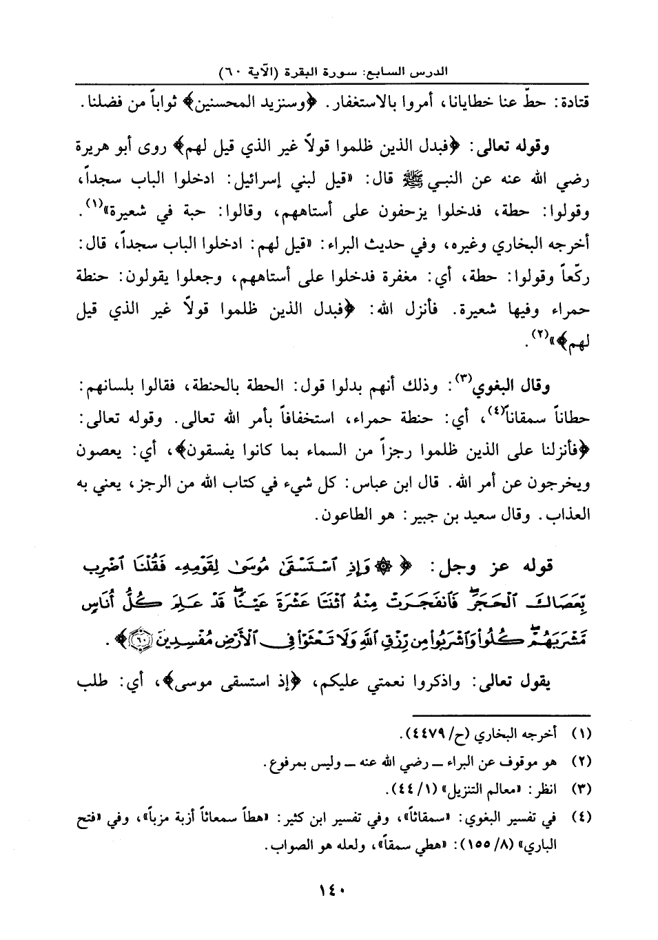 الباب سجدًا، وقولوا حطة، فدخلوا يزحفون على أستاههم، وقالوا: حبة في شعيرة» . أخرجه البخاري وغيره، وفي حديث البراء: «قيل لهم: ادخلوا الباب سجداً، قال: ركعاً وقولوا: حطة، أي: مغفرة فدخلوا على أستاههم وجعلوا يقولون: حنطة حمراء وفيها شعيرة. فأنزل الله: {فبدل الذين ظلموا قولاً غير الذي قيل لهم} » .