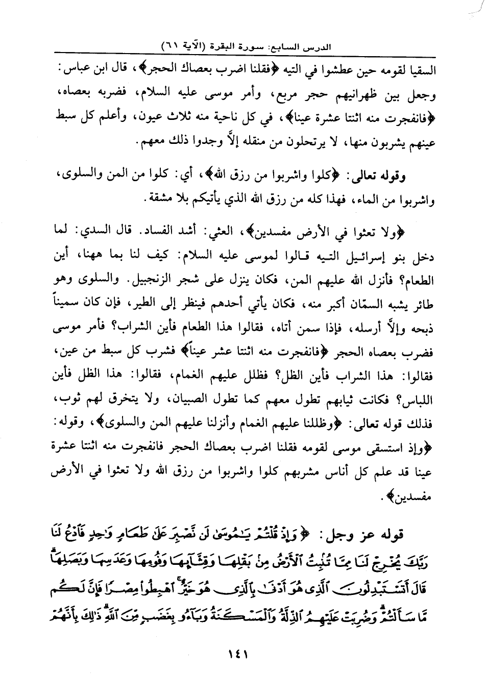 {وَلاَ تَعْثَوْاْ فِي الأَرْضِ مُفْسِدِينَ} ، العثي: أشد الفساد. قال السدي: لما دخل بنو إسرائيل التيه قالوا لموسى عليه السلام: كيف لنا بما ها هنا، أين الطعام؟ فأنزل الله عليهم المن، فكان ينزل على شجر الزنجبيل. والسلوى وهو: طائر يشبه السمّان أكبر منه، فكان يأتي أحدهم فينظر إلى الطير، فإن كان سمينًا ذبحه وإلا أرسله، فإذا سمن أتاه، فقالوا هذا الطعام فأين الشراب؟ فأمر موسى فضرب بعصاه الحجر ... {فَانفَجَرَتْ مِنْهُ اثْنَتَا عَشْرَةَ عَيْناً} فشرب كل سبط من عين، فقالوا: هذا الشراب فأين الظل؟ فظلل عليهم الغمام، فقالوا: هذا الظل فأين اللباس؟ فكانت ثيابهم تطول معهم كما تطول الصبيان، ولا يتخرق لهم ثوب، فلذلك قوله تعالى: {وَظَلَّلْنَا عَلَيْكُمُ الْغَمَامَ وَأَنزَلْنَا عَلَيْكُمُ الْمَنَّ وَالسَّلْوَى} ، وقوله: {وَإِذِ اسْتَسْقَى مُوسَى لِقَوْمِهِ فَقُلْنَا اضْرِب بِّعَصَاكَ الْحَجَرَ فَانفَجَرَتْ مِنْهُ اثْنَتَا عَشْرَةَ عَيْناً قَدْ عَلِمَ كُلُّ أُنَاسٍ مَّشْرَبَهُمْ كُلُواْ وَاشْرَبُواْ مِن رِّزْقِ اللَّهِ وَلاَ تَعْثَوْاْ فِي الأَرْضِ مُفْسِدِينَ} .