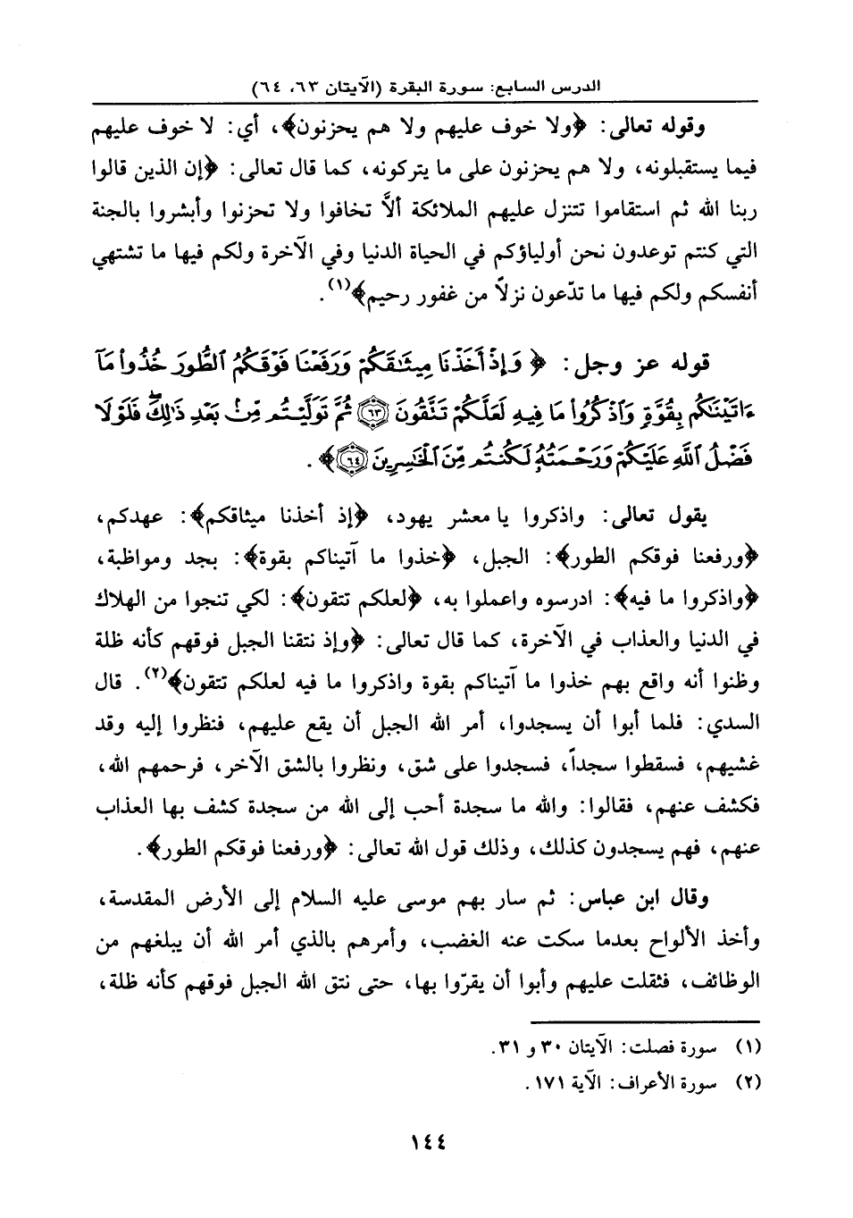 قوله عز وجل: {وَإِذْ أَخَذْنَا مِيثَاقَكُمْ وَرَفَعْنَا فَوْقَكُمُ الطُّورَ خُذُواْ مَا آتَيْنَاكُم بِقُوَّةٍ وَاذْكُرُواْ مَا فِيهِ لَعَلَّكُمْ تَتَّقُونَ (63) ثُمَّ تَوَلَّيْتُم مِّن بَعْدِ ذَلِكَ فَلَوْلاَ فَضْلُ اللَّهِ عَلَيْكُمْ وَرَحْمَتُهُ لَكُنتُم مِّنَ الْخَاسِرِينَ (64) } .