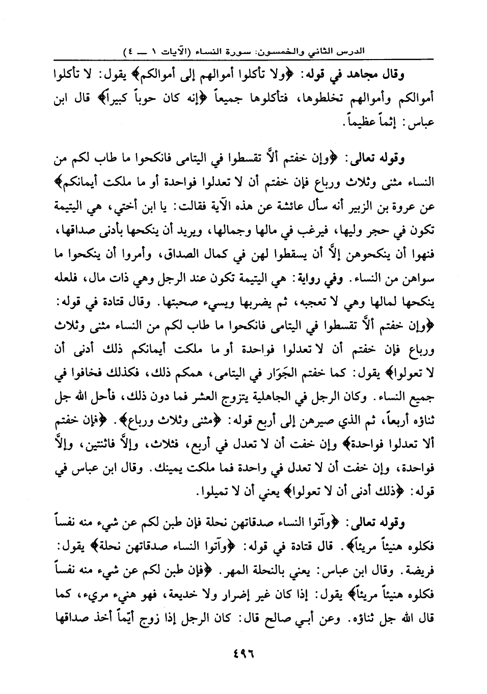 وقوله تعالى: {وَإِنْ خِفْتُمْ أَلا تُقْسِطُواْ فِي الْيَتَامَى فَانكِحُواْ مَا طَابَ لَكُم مِّنَ النِّسَاء مَثْنَى وَثُلاَثَ وَرُبَاعَ فَإِنْ خِفْتُمْ أَلا تَعْدِلُواْ فَوَاحِدَةً أَوْ مَا مَلَكَتْ أَيْمَانُكُمْ} ، عن عروة بن الزبير أنه سأل عائشة عن هذه الآية فقالت: يا ابن أختي، هي: اليتيمة تكون في حِجر ولِّيها، فيرغب في مالها وجمالها، ويريد أن ينكحها بأدنى صداقها، فنهوا أن ينكحوهن إلا أن يقسطوا لهن في كمال الصداق، وأمروا أن ينكحوا ما سواهُنَّ من النساء. وفي رواية: هي: اليتيمة تكون عند الرجل وهي ذات مال، فلعله ينكحها لمالها وهي لا تعجبه، ثم يضربها ويسيء صحبتها. وقال قتادة في قوله: {وَإِنْ خِفْتُمْ أَلا تُقْسِطُواْ فِي الْيَتَامَى فَانكِحُواْ مَا طَابَ لَكُم مِّنَ النِّسَاء مَثْنَى وَثُلاَثَ وَرُبَاعَ فَإِنْ خِفْتُمْ أَلا تَعْدِلُواْ فَوَاحِدَةً أَوْ مَا مَلَكَتْ أَيْمَانُكُمْ ذَلِكَ أَدْنَى أَلا تَعُولُواْ} ، يقول: كما خفتم الجَوَار في اليتامى همكم ذلك. فكذلك فخافوا في جميع النساء. وكان الرجل في الجاهلية يتزوج العشر فما دون ذلك، فأحل الله جل ثناؤه أربعًا، ثم الذي صيرهن إلى أربع قوله: {مَثْنَى وَثُلاَثَ وَرُبَاعَ} . {فَإِنْ خِفْتُمْ أَلا تَعْدِلُواْ فَوَاحِدَةً} ، وإن خفت أن لا تعدل في أربع، فثلاث، وإلا