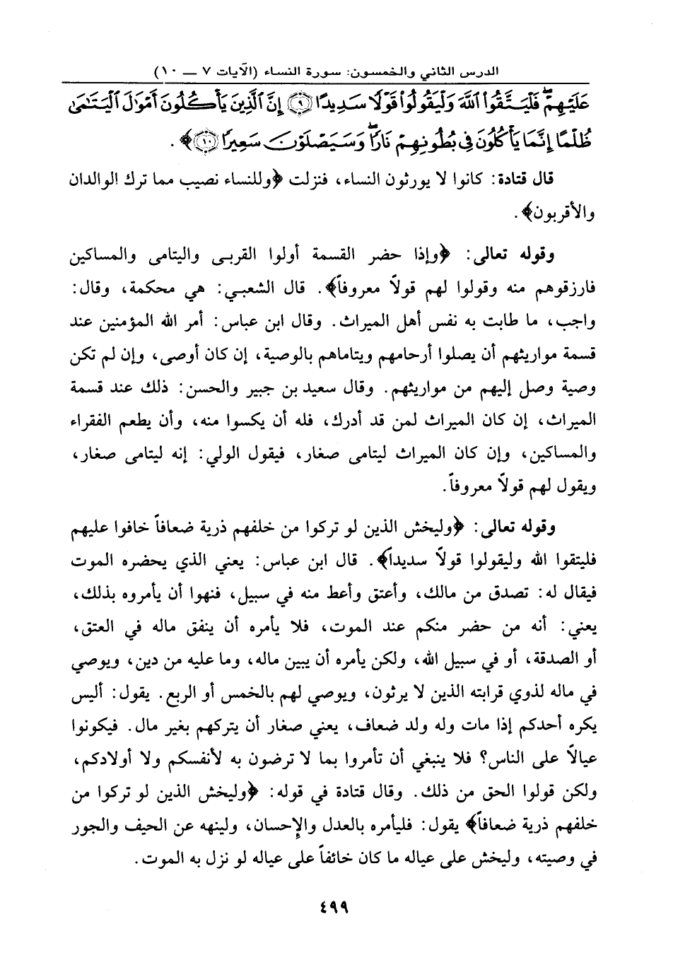 وقوله تعالى: {وَلْيَخْشَ الَّذِينَ لَوْ تَرَكُواْ مِنْ خَلْفِهِمْ ذُرِّيَّةً ضِعَافاً خَافُواْ عَلَيْهِمْ فَلْيَتَّقُوا اللهَ وَلْيَقُولُواْ قَوْلاً سَدِيداً} . قال ابن عباس: يعني: الذي يحضره الموت فيقال له: تصدق من مالك، وأعتق وأعط منه في سبيل، فنهوا أن يأمروه بذلك، يعني: أنه من حضر منكم عند الموت فلا يأمره أن ينفق ماله في العتق، أو الصدقة، أو في سبيل الله، ولكن يأمره أن يبين ماله، وما عليه من دين، ويوصي في ماله لذوي قرابته الذين لا يرثون، ويوصي لهم بالخمس أو الربع. يقول: أليس يكره أحدكم إذا مات وله ولد ضعاف، يعني: صغار. أن يتركهم بغير مال. فيكونوا عيالاً على الناس؟ فلا ينبغي أن تأمروا بما لا ترضون به لأنفسكم ولا أولادكم، ولكن قولوا الحق من ذلك. وقال قتادة في قوله: {وَلْيَخْشَ الَّذِينَ لَوْ تَرَكُواْ مِنْ خَلْفِهِمْ ذُرِّيَّةً ضِعَافاً} يقول: فليأمره بالعدل