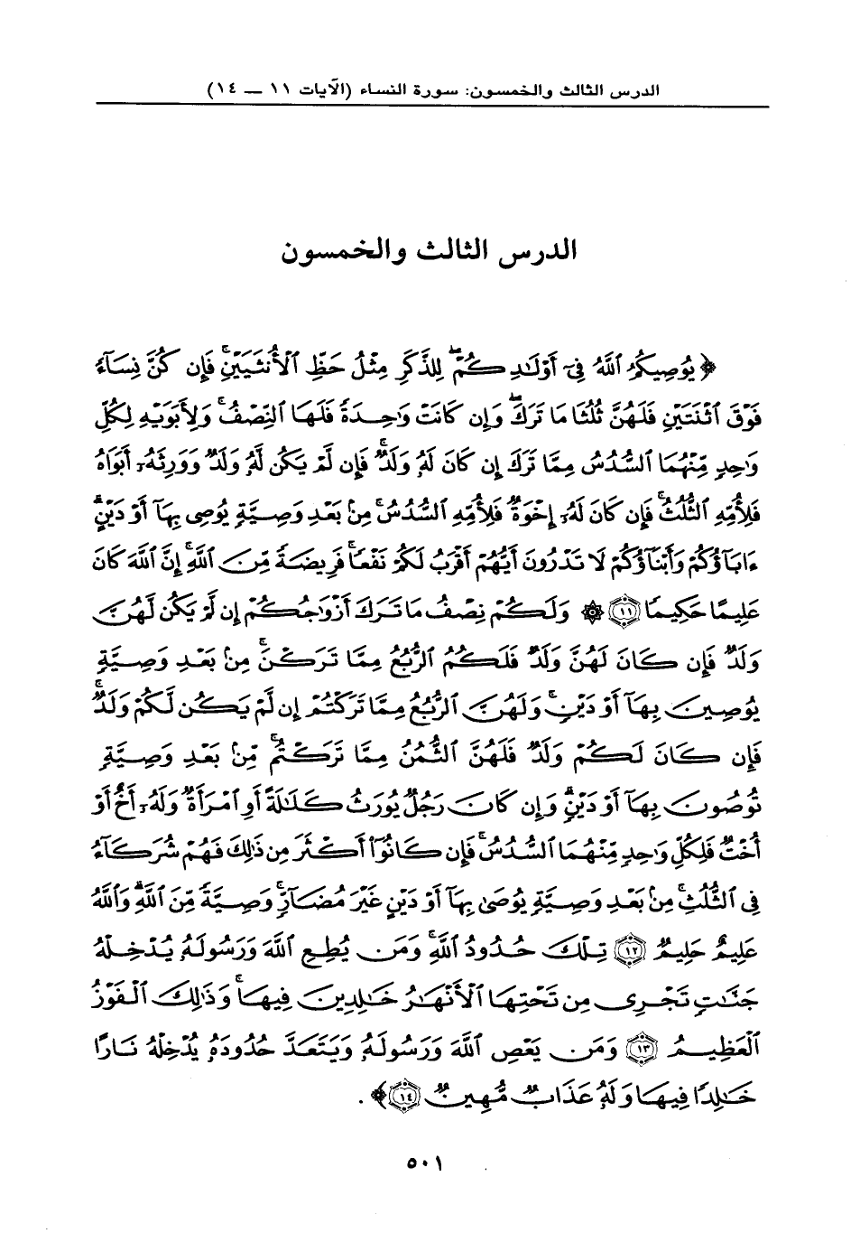 {يُوصِيكُمُ اللهُ فِي أَوْلاَدِكُمْ لِلذَّكَرِ مِثْلُ حَظِّ الأُنثَيَيْنِ فَإِن كُنَّ نِسَاء فَوْقَ اثْنَتَيْنِ فَلَهُنَّ ثُلُثَا مَا تَرَكَ وَإِن كَانَتْ وَاحِدَةً فَلَهَا النِّصْفُ وَلأَبَوَيْهِ لِكُلِّ وَاحِدٍ مِّنْهُمَا السُّدُسُ مِمَّا تَرَكَ إِن كَانَ لَهُ وَلَدٌ فَإِن لَّمْ يَكُن لَّهُ وَلَدٌ وَوَرِثَهُ أَبَوَاهُ فَلأُمِّهِ الثُّلُثُ فَإِن كَانَ لَهُ إِخْوَةٌ فَلأُمِّهِ السُّدُسُ مِن بَعْدِ وَصِيَّةٍ يُوصِي بِهَا أَوْ دَيْنٍ آبَآؤُكُمْ وَأَبناؤُكُمْ لاَ تَدْرُونَ أَيُّهُمْ أَقْرَبُ لَكُمْ نَفْعاً فَرِيضَةً مِّنَ اللهِ إِنَّ اللهَ كَانَ عَلِيما حَكِيماً (11) وَلَكُمْ نِصْفُ مَا تَرَكَ أَزْوَاجُكُمْ إِن لَّمْ يَكُن لَّهُنَّ وَلَدٌ فَإِن كَانَ لَهُنَّ وَلَدٌ فَلَكُمُ الرُّبُعُ مِمَّا تَرَكْنَ مِن بَعْدِ وَصِيَّةٍ يُوصِينَ بِهَا أَوْ دَيْنٍ وَلَهُنَّ الرُّبُعُ مِمَّا تَرَكْتُمْ إِن لَّمْ يَكُن لَّكُمْ وَلَدٌ فَإِن كَانَ لَكُمْ وَلَدٌ فَلَهُنَّ الثُّمُنُ مِمَّا تَرَكْتُم مِّن بَعْدِ وَصِيَّةٍ تُوصُونَ بِهَا أَوْ دَيْنٍ وَإِن كَانَ رَجُلٌ يُورَثُ كَلاَلَةً أَو امْرَأَةٌ وَلَهُ أَخٌ أَوْ أُخْتٌ فَلِكُلِّ وَاحِدٍ مِّنْهُمَا السُّدُسُ فَإِن كَانُوَاْ أَكْثَرَ مِن ذَلِكَ فَهُمْ شُرَكَاء فِي الثُّلُثِ مِن بَعْدِ وَصِيَّةٍ يُوصَى بِهَا أَوْ دَيْنٍ غَيْرَ مُضَآرٍّ وَصِيَّةً مِّنَ اللهِ وَاللهُ عَلِيمٌ حَلِيمٌ (12) تِلْكَ حُدُودُ اللهِ وَمَن يُطِعِ اللهَ وَرَسُولَهُ يُدْخِلْهُ جَنَّاتٍ تَجْرِي مِن تَحْتِهَا الأَنْهَارُ خَالِدِينَ فِيهَا وَذَلِكَ الْفَوْزُ الْعَظِيمُ (13) وَمَن يَعْصِ اللهَ وَرَسُولَهُ وَيَتَعَدَّ حُدُودَهُ يُدْخِلْهُ نَاراً خَالِداً فِيهَا وَلَهُ عَذَابٌ مُّهِينٌ (14) } .