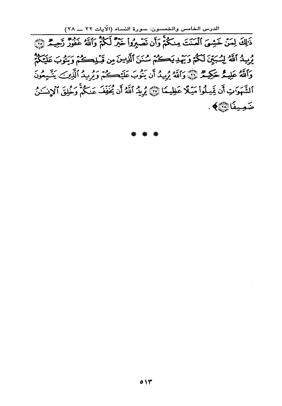 ذَلِكَ لِمَنْ خَشِيَ الْعَنَتَ مِنْكُمْ وَأَن تَصْبِرُواْ خَيْرٌ لَّكُمْ وَاللهُ غَفُورٌ رَّحِيمٌ (25) يُرِيدُ اللهُ لِيُبَيِّنَ لَكُمْ وَيَهْدِيَكُمْ سُنَنَ الَّذِينَ مِن قَبْلِكُمْ وَيَتُوبَ عَلَيْكُمْ وَاللهُ عَلِيمٌ حَكِيمٌ (26) وَاللهُ يُرِيدُ أَن يَتُوبَ عَلَيْكُمْ وَيُرِيدُ الَّذِينَ يَتَّبِعُونَ الشَّهَوَاتِ أَن