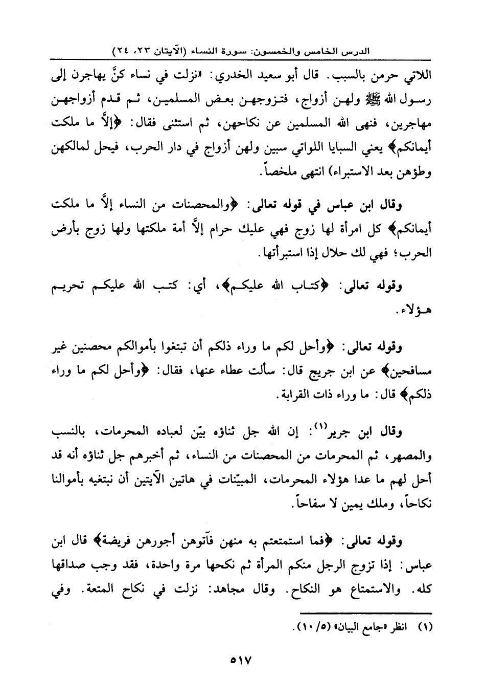 وقال ابن جرير: إن الله جل ثناؤه بيّن لعباده المحرمات، بالنسب والمصهر، ثم المحرمات من المحصنات من النساء، ثم أخبرهم جل ثناءه أنه