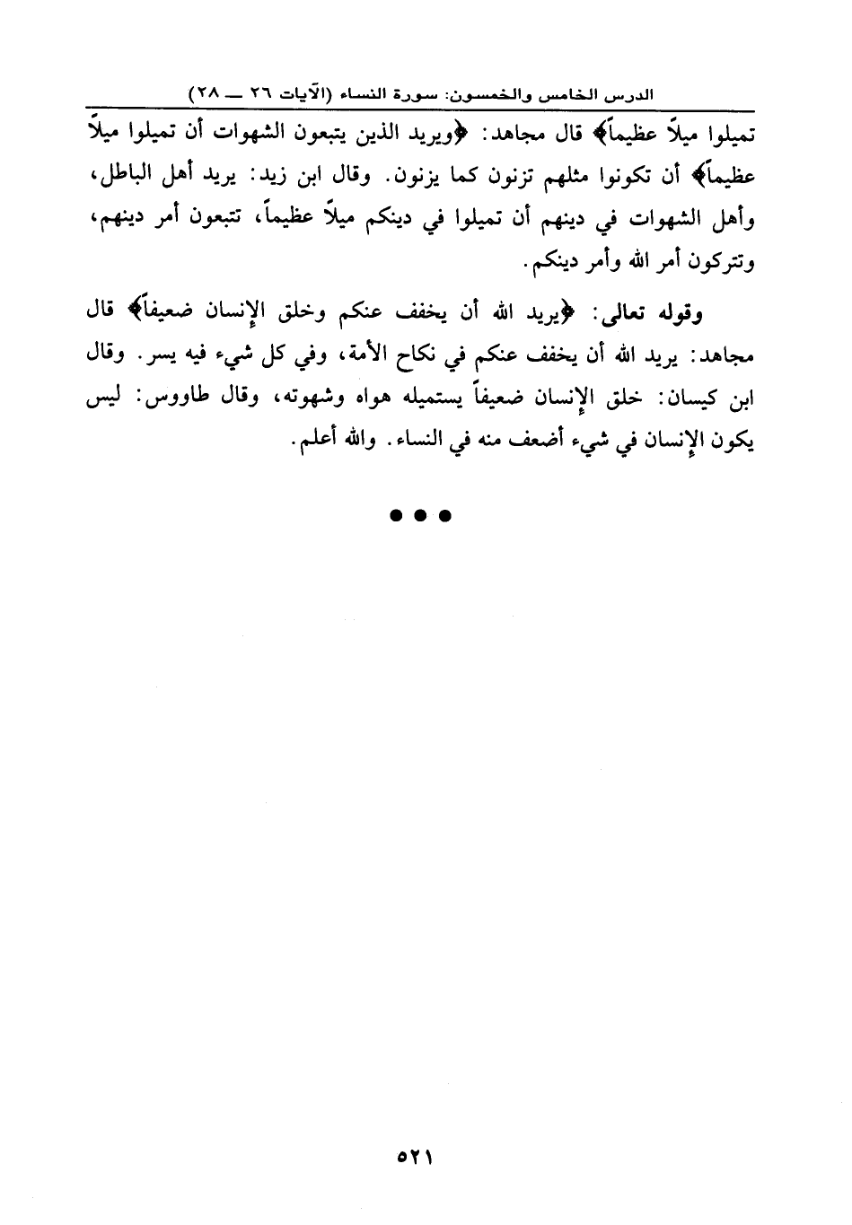 وقوله تعالى: {يُرِيدُ اللهُ أَن يُخَفِّفَ عَنكُمْ وَخُلِقَ الإِنسَانُ ضَعِيفاً} ، قال مجاهد: يريد الله أن يخفف عنكم في نكاح الأمة، وفي كل شيء فيه يسر. وقال ابن كيسان: خلق الإِنسان ضعيفًا، يستميله هواه وشهوته، وقال طاووس: ليس يكون الإِنسان في شيء أضعف منه في النساء. والله أعلم.