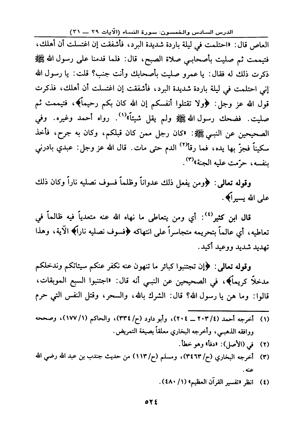 إن اغتسلت أن أهلك، فتيممت ثم صليت بأصحابي صلاة الصبح، قال: فلما قدمنا على رسول الله - صلى الله عليه وسلم - ذكرت ذلك له فقال: يا عمرو صليت بأصحابك وأنت جنب؟ قلت يا رسول الله إني احتلمت في ليلة باردة شديدة البرد، فأشفقت إن اغتسلت أن أهلك، فذكرت قول الله عز وجل: {وَلاَ تَقْتُلُواْ أَنفُسَكُمْ إِنَّ اللهَ كَانَ بِكُمْ رَحِيماً} ، فتيممت ثم صليت. فضحك رسول الله - صلى الله عليه وسلم - ولم يقل شيئًا) . رواه أحمد وغيره. وفي الصحيحين عن النبي - صلى الله عليه وسلم -: «كان رجل ممن كان قبلكم، وكان به جرح، فأخذ سكينًا فجز بها يده، فما رقأ الدم حتى مات. قال الله عز وجل: عبدي بادرني بنفسه، حرمت عليه الجنة» .