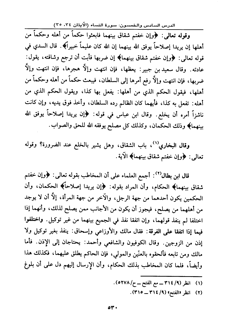 قال ابن بطال: أجمع العلماء على أن المخاطب بقوله تعالى: {وَإِنْ خِفْتُمْ شِقَاقَ بَيْنِهِمَا} ، الحكام، وأن المراد بقوله: {إِن يُرِيدَا إِصْلاَحاً} ، الحكمان، وأن الحكمين يكون أحدهما من جهة الرجل، والآخر من جهة المرأة، إلا أن لا يوجد من أهلهما من يصلح، فيجوز أن يكون من الأجانب ممن يصلح لذلك، وأنهما إذا اختلفا لم ينفذ قولهما، وإن اتفقا نفذ في الجميع بينهما من غير توكيل. واختلفوا فيما إذا اتفقا على الفرقة: فقال مالك، والأوزاعي، وإسحاق: ينفذ بغير توكيل ولا إذن من الزوجين. وقال الكوفيون، والشافعي، وأحمد: يحتاجان إلا الإذن. فأما مالك ومن تابعه فألحقوه بالعنّين والمولى، فإن الحاكم يطلق عليهما، فكذلك هذا وأيضًا، فلما كان المخاطب بذلك الحكام، وأن الإرسال إليهم دل على أن بلوغ