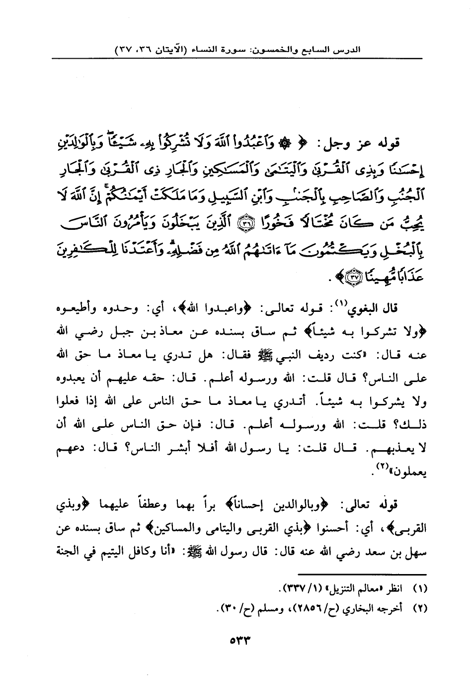 قوله عز وجل: {وَاعْبُدُواْ اللهَ وَلاَ تُشْرِكُواْ بِهِ شَيْئاً وَبِالْوَالِدَيْنِ إِحْسَاناً وَبِذِي الْقُرْبَى وَالْيَتَامَى وَالْمَسَاكِينِ وَالْجَارِ ذِي الْقُرْبَى وَالْجَارِ الْجُنُبِ وَالصَّاحِبِ بِالجَنبِ وَابْنِ السَّبِيلِ وَمَا مَلَكَتْ أَيْمَانُكُمْ إِنَّ اللهَ لاَ يُحِبُّ مَن كَانَ مُخْتَالاً فَخُوراً (36) الَّذِينَ يَبْخَلُونَ وَيَأْمُرُونَ النَّاسَ بِالْبُخْلِ وَيَكْتُمُونَ مَا آتَاهُمُ اللهُ مِن فَضْلِهِ وَأَعْتَدْنَا لِلْكَافِرِينَ عَذَاباً مُّهِيناً (37) } .