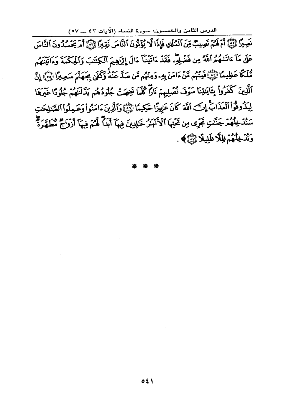 نَصِيراً (52) أَمْ لَهُمْ نَصِيبٌ مِّنَ الْمُلْكِ فَإِذاً لا يُؤْتُونَ النَّاسَ نَقِيراً (53) أَمْ يَحْسُدُونَ النَّاسَ عَلَى مَا آتَاهُمُ اللهُ مِن فَضْلِهِ فَقَدْ آتَيْنَا آلَ إِبْرَاهِيمَ الْكِتَابَ وَالْحِكْمَةَ وَآتَيْنَاهُم مُّلْكاً عَظِيماً (54) فَمِنْهُم مَّنْ آمَنَ بِهِ وَمِنْهُم مَّن صَدَّ عَنْهُ وَكَفَى بِجَهَنَّمَ سَعِيراً (55) إِنَّ الَّذِينَ كَفَرُواْ بِآيَاتِنَا سَوْفَ نُصْلِيهِمْ نَاراً كُلَّمَا نَضِجَتْ جُلُودُهُمْ بَدَّلْنَاهُمْ جُلُوداً غَيْرَهَا لِيَذُوقُواْ الْعَذَابَ إِنَّ اللهَ كَانَ عَزِيزاً حَكِيماً (56) وَالَّذِينَ آمَنُواْ وَعَمِلُواْ الصَّالِحَاتِ سَنُدْخِلُهُمْ جَنَّاتٍ تَجْرِي مِن تَحْتِهَا الأَنْهَارُ خَالِدِينَ فِيهَا أَبَداً لَّهُمْ فِيهَا أَزْوَاجٌ مُّطَهَّرَةٌ وَنُدْخِلُهُمْ ظِلاًّ ظَلِيلاً (57) } .