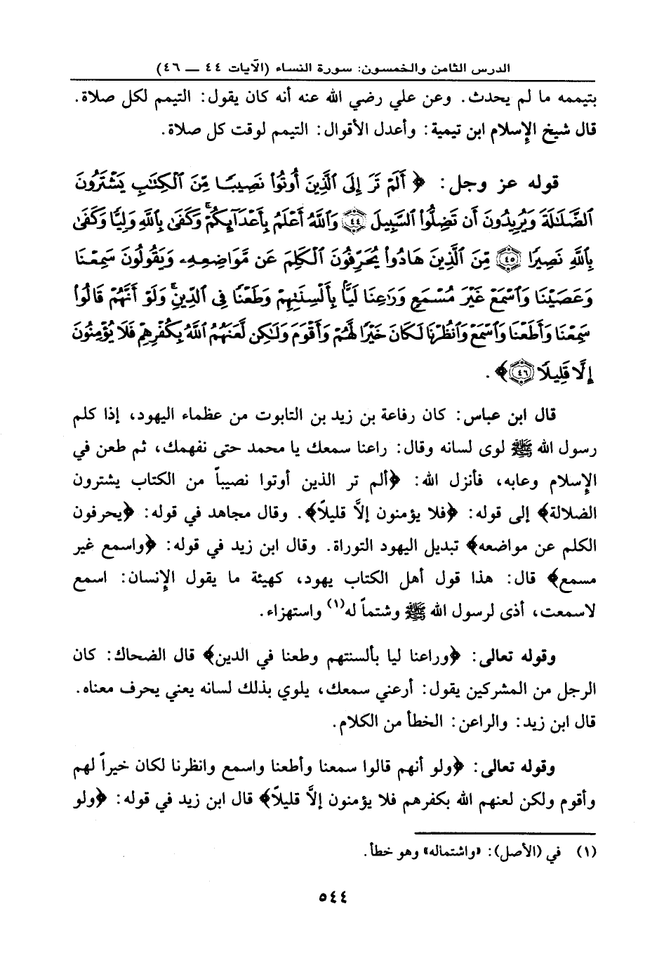 قوله عز وجل: {أَلَمْ تَرَ إِلَى الَّذِينَ أُوتُواْ نَصِيباً مِّنَ الْكِتَابِ يَشْتَرُونَ الضَّلاَلَةَ وَيُرِيدُونَ أَن تَضِلُّواْ السَّبِيلَ (44) وَاللهُ أَعْلَمُ بِأَعْدَائِكُمْ وَكَفَى بِاللهِ وَلِيّاً وَكَفَى بِاللهِ نَصِيراً (45) مِّنَ الَّذِينَ هَادُواْ يُحَرِّفُونَ الْكَلِمَ عَن مَّوَاضِعِهِ وَيَقُولُونَ سَمِعْنَا وَعَصَيْنَا وَاسْمَعْ غَيْرَ مُسْمَعٍ وَرَاعِنَا لَيّاً بِأَلْسِنَتِهِمْ وَطَعْناً فِي الدِّينِ وَلَوْ أَنَّهُمْ قَالُواْ سَمِعْنَا وَأَطَعْنَا وَاسْمَعْ وَانظُرْنَا لَكَانَ خَيْراً لَّهُمْ وَأَقْوَمَ وَلَكِن لَّعَنَهُمُ اللهُ بِكُفْرِهِمْ فَلاَ يُؤْمِنُونَ إِلا قَلِيلاً (46) } .
