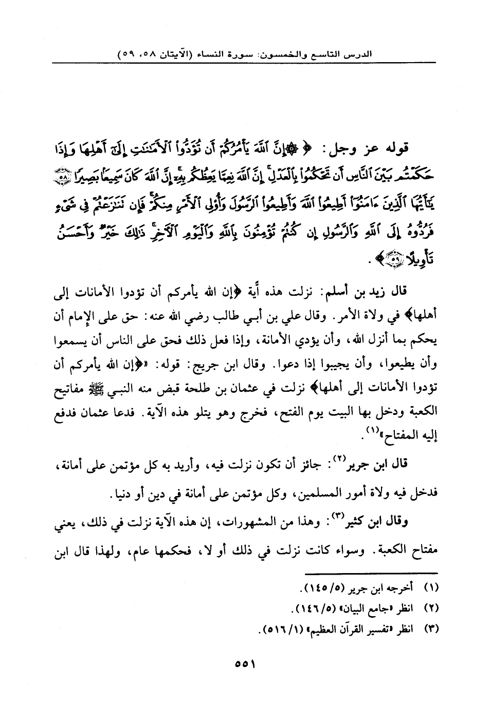 قوله عز وجل: {إِنَّ اللهَ يَأْمُرُكُمْ أَن تُؤدُّواْ الأَمَانَاتِ إِلَى أَهْلِهَا وَإِذَا حَكَمْتُم بَيْنَ النَّاسِ أَن تَحْكُمُواْ بِالْعَدْلِ إِنَّ اللهَ نِعِمَّا يَعِظُكُم بِهِ إِنَّ اللهَ كَانَ سَمِيعاً بَصِيراً (58) يَا أَيُّهَا الَّذِينَ آمَنُواْ أَطِيعُواْ اللهَ وَأَطِيعُواْ الرَّسُولَ وَأُوْلِي الأَمْرِ مِنكُمْ فَإِن تَنَازَعْتُمْ فِي شَيْءٍ فَرُدُّوهُ إِلَى اللهِ وَالرَّسُولِ إِن كُنتُمْ تُؤْمِنُونَ بِاللهِ وَالْيَوْمِ الآخِرِ ذَلِكَ خَيْرٌ وَأَحْسَنُ تَأْوِيلاً (59) } .