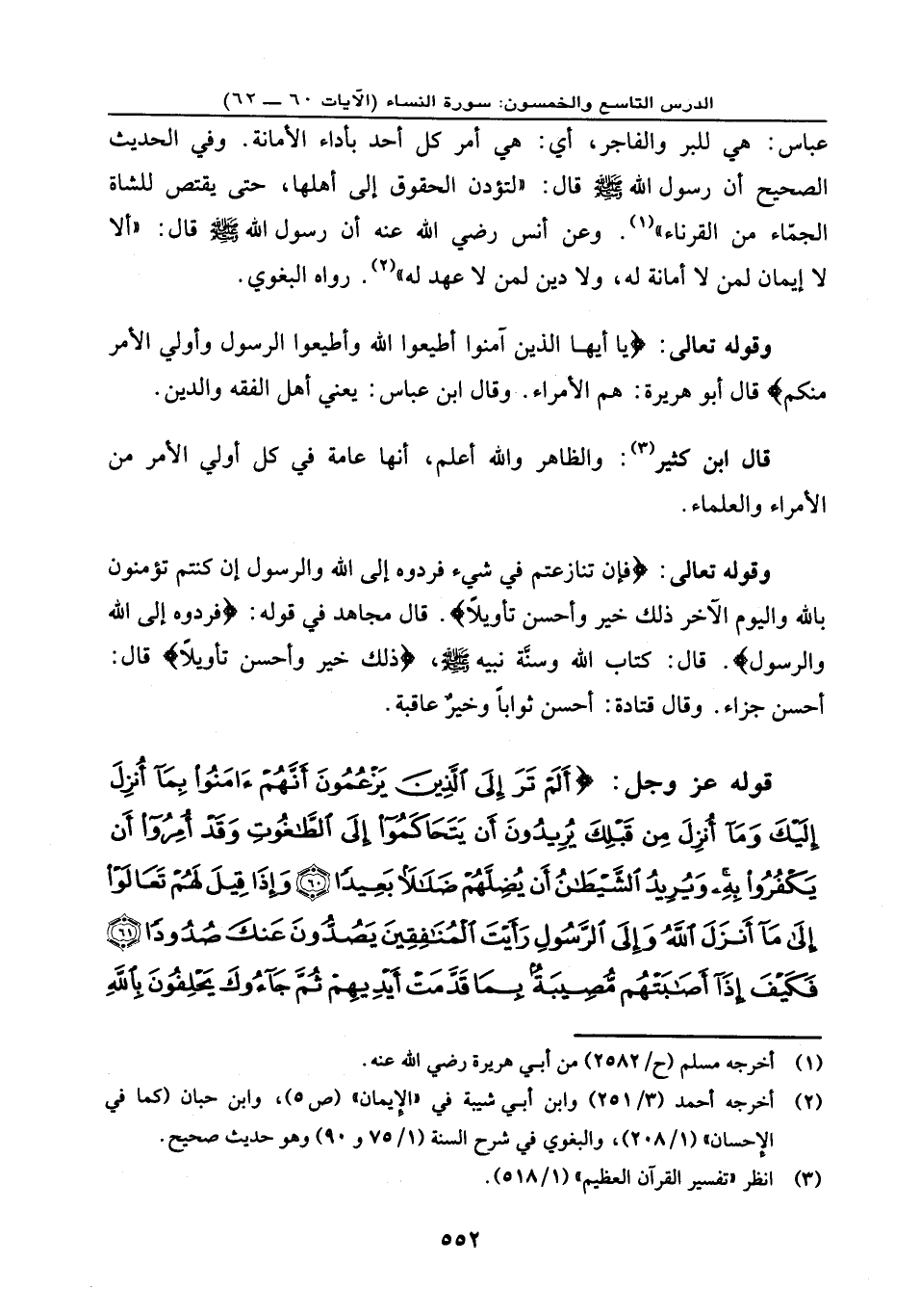 كل أحد بأداء الأمانة. وفي الحديث الصحيح أن رسول الله - صلى الله عليه وسلم - قال: «لتؤدن الحقوق إلى أهلها، حتى يقتص للشاة الجمّاء من القرناء» . وعن أنس رضي الله عنه أن رسول الله قال: «ألا لا إيمان لمن لا أمانة له، ولا دين لمن لا عهد له» . رواه البغوي.