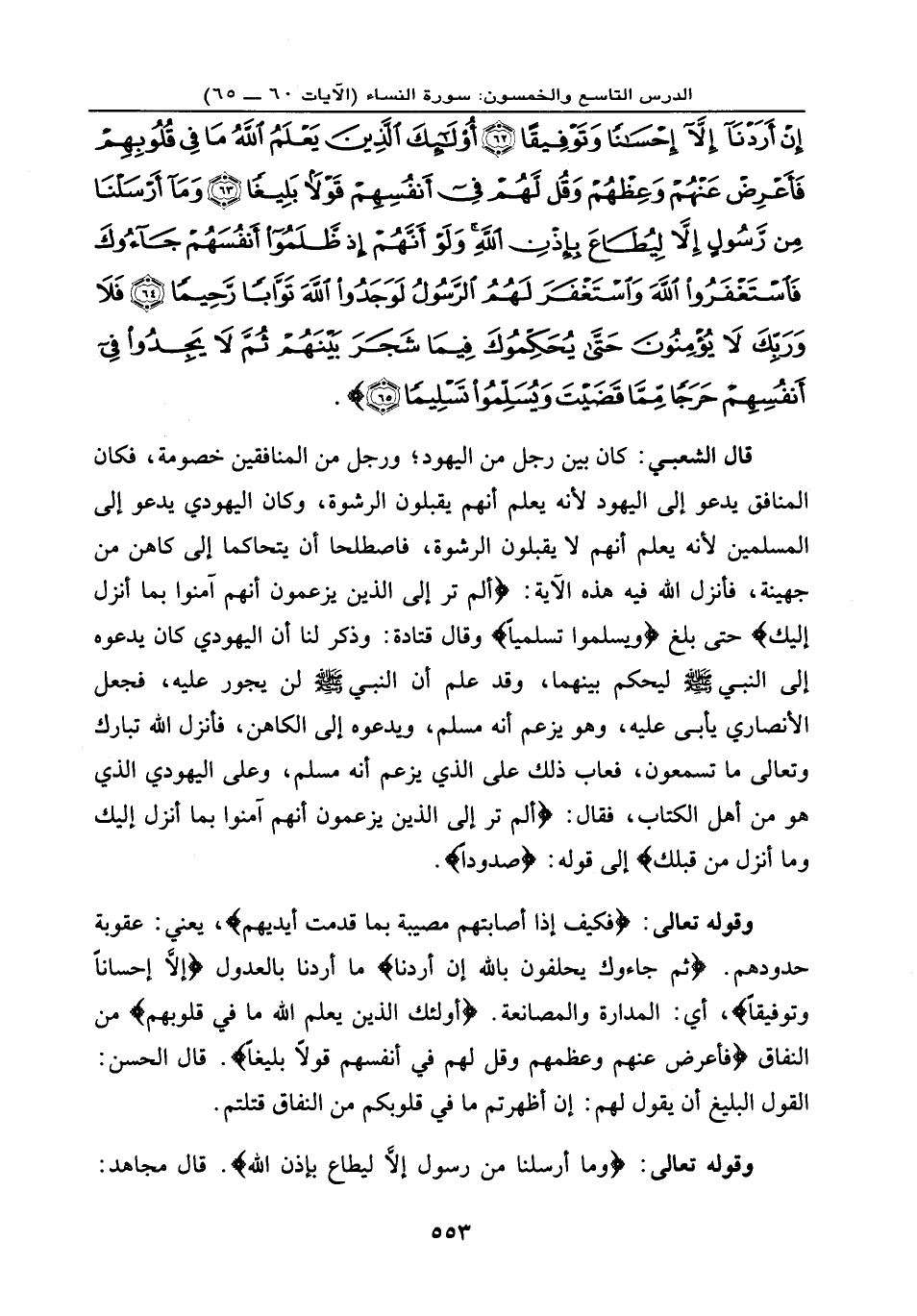 قال الشعبي: كان بين رجل من اليهود ورجل من المنافقين ... خصومة، فكان المنافق يدعوا إلى اليهود لأنه يعلم أنهم يقبلون الرشوة، وكان اليهودي يدعوا إلى المسلمين لأنه يعلم أنهم لا يقبلون الرشوة فاصطلحا أن يتحاكما إلى كاهن من جهينة، فأنزل الله فيه هذه الآية: {أَلَمْ تَرَ إِلَى الَّذِينَ يَزْعُمُونَ أَنَّهُمْ آمَنُواْ بِمَا أُنزِلَ إِلَيْكَ} حتى بلغ: ... {وَيُسَلِّمُواْ تَسْلِيماً} وقال قتادة: وذكر لنا أن اليهودي كان يدعوه إلى النبي - صلى الله عليه وسلم - ليحكم بينهما، وقد علم أن النبي - صلى الله عليه وسلم - لن يجور عليه، فجعل الأنصاري يأبى عليه، وهو يزعم أنه مسلم، ويدعوه إلى الكاهن، فأنزل الله تبارك وتعالى ما تسمعون، فعاب ذلك على الذي يزعم أنه مسلم، وعلى اليهودي الذي هو من أهل الكتاب، فقال: {أَلَمْ تَرَ إِلَى الَّذِينَ يَزْعُمُونَ أَنَّهُمْ آمَنُواْ بِمَا أُنزِلَ إِلَيْكَ وَمَا أُنزِلَ مِن قَبْلِكَ} إلى قوله: ... {صُدُوداً} .