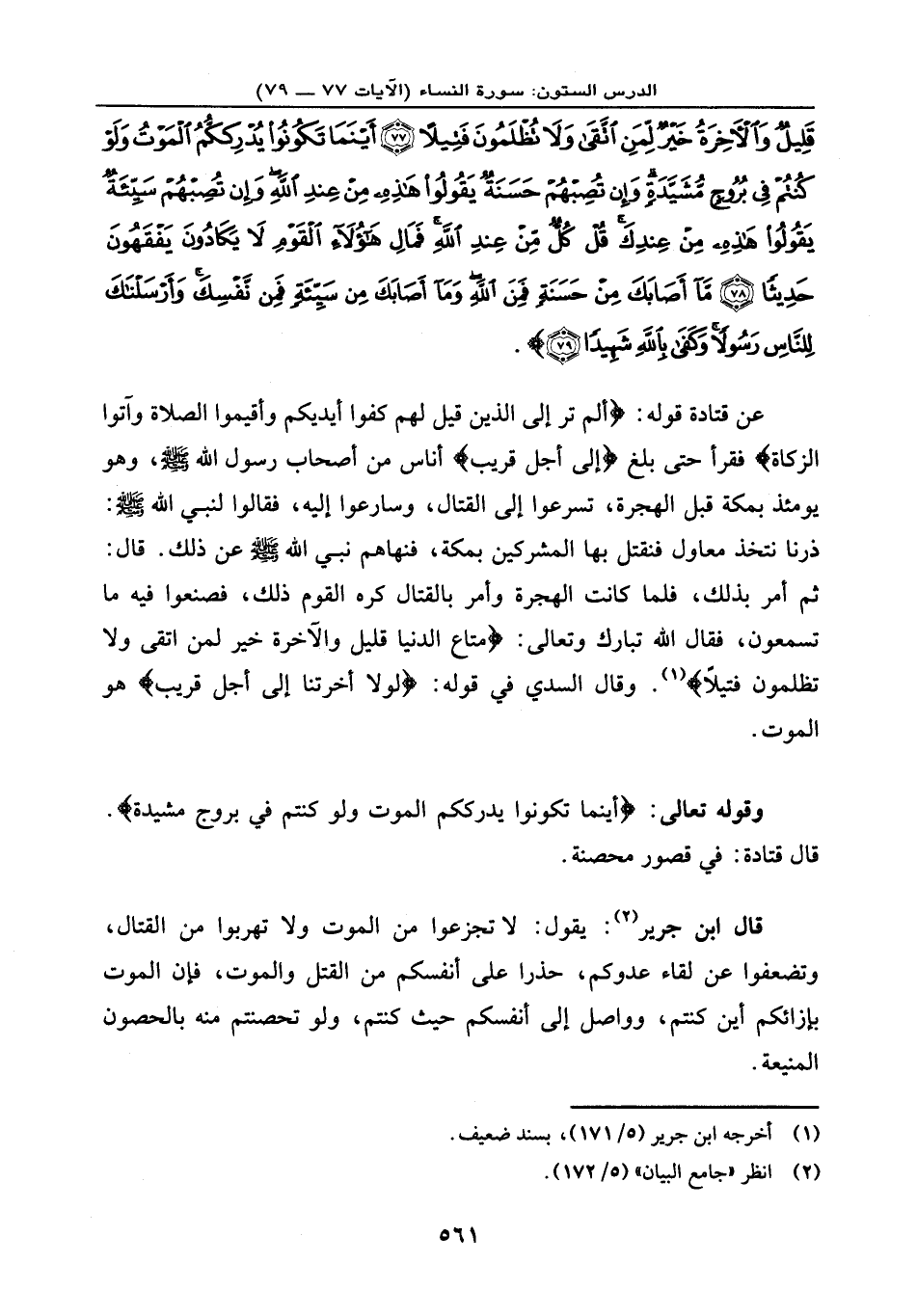 قَلِيلٌ وَالآخِرَةُ خَيْرٌ لِّمَنِ اتَّقَى وَلاَ تُظْلَمُونَ فَتِيلاً (77) أَيْنَمَا تَكُونُواْ يُدْرِككُّمُ الْمَوْتُ وَلَوْ كُنتُمْ فِي بُرُوجٍ مُّشَيَّدَةٍ وَإِن تُصِبْهُمْ حَسَنَةٌ يَقُولُواْ هَذِهِ مِنْ عِندِ اللهِ وَإِن تُصِبْهُمْ سَيِّئَةٌ يَقُولُواْ هَذِهِ مِنْ عِندِكَ قُلْ كُلًّ مِّنْ عِندِ اللهِ فَمَا لِهَؤُلاء الْقَوْمِ لاَ يَكَادُونَ يَفْقَهُونَ حَدِيثاً (78) مَّا أَصَابَكَ مِنْ حَسَنَةٍ فَمِنَ اللهِ وَمَا أَصَابَكَ مِن سَيِّئَةٍ فَمِن نَّفْسِكَ وَأَرْسَلْنَاكَ لِلنَّاسِ رَسُولاً وَكَفَى بِاللهِ شَهِيداً (79) } .