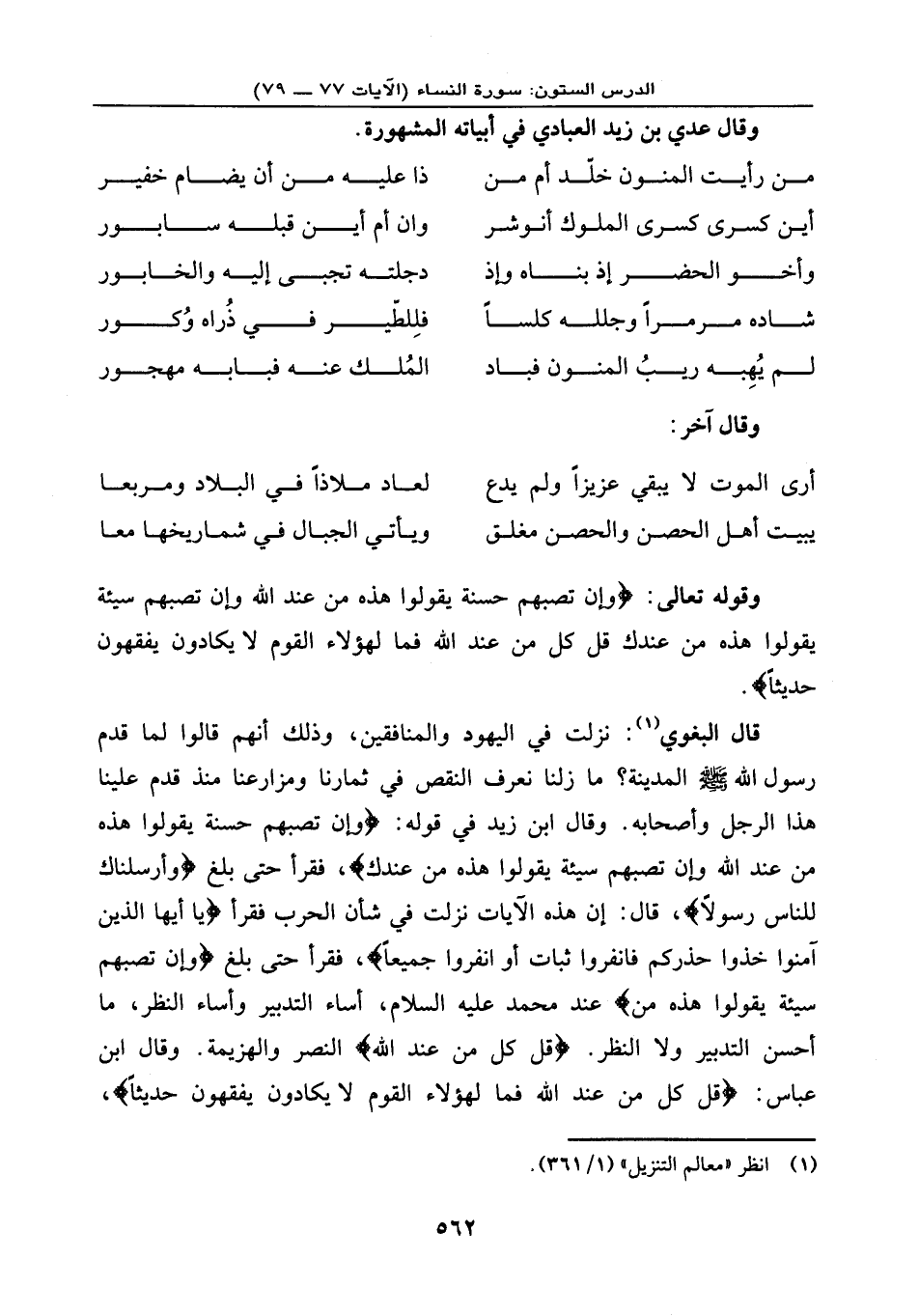 قال البغوي: نزلت في اليهود، والمنافقين، وذلك أنهم قالوا لما قدم رسول الله - صلى الله عليه وسلم - المدينة: ما زلنا نعرف النقص في ثمارنا ومزارعنا منذ قدم علينا هذا الرجل وأصحابه. وقال ابن زيد في قوله: {وَإِن تُصِبْهُمْ حَسَنَةٌ يَقُولُواْ هَذِهِ مِنْ عِندِ اللهِ وَإِن تُصِبْهُمْ سَيِّئَةٌ يَقُولُواْ هَذِهِ مِنْ عِندِكَ} ، فقرأ حتى بلغ: {وَأَرْسَلْنَاكَ لِلنَّاسِ رَسُولاً} ، قال: إن هذه الآيات نزلت في شأن الحرب فقرأ: {يَا أَيُّهَا الَّذِينَ آمَنُواْ خُذُواْ حِذْرَكُمْ فَانفِرُواْ ثُبَاتٍ أَوِ انفِرُواْ جَمِيعاً} ، فقرأ حتى بلغ: {وَإِن تُصِبْهُمْ سَيِّئَةٌ يَقُولُواْ هَذِهِ مِنْ} عند محمد عليه السلام، أساء التدبير وأساء النظر، ما أحسن التدبير ولا النظر. {قُلْ كُلًّ مِّنْ عِندِ اللهِ} ، النصر، والهزيمة. وقال ابن عباس: {قُلْ كُلًّ مِّنْ عِندِ اللهِ فَمَا لِهَؤُلاء الْقَوْمِ لاَ يَكَادُونَ يَفْقَهُونَ حَدِيثاً} ،